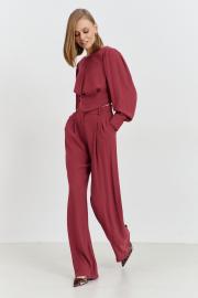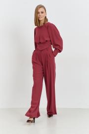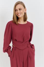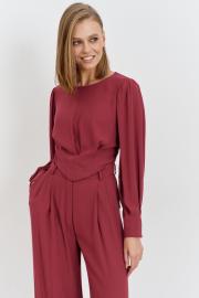 Блузка женская, из блузочной ткани, полуприлегающего силуэта, короткая, застежка расположена в среднем шве спинки на потайную молнию. Перед с тремя застроченными складками, по складкам проложены отделочные строчки. Спинка со средним швом, в шве обработан разрез горловины, с двумя застроченными складками, по складкам проложены отделочные строчки. Рукава длинные, окат рукава со сборкой. Низ рукава с тремя застроченными складками, по складкам проложены отделочные строчки. Горловина переда и спинки круглая, горловина спинки с застежкой на навесную петлю и пуговицу.
