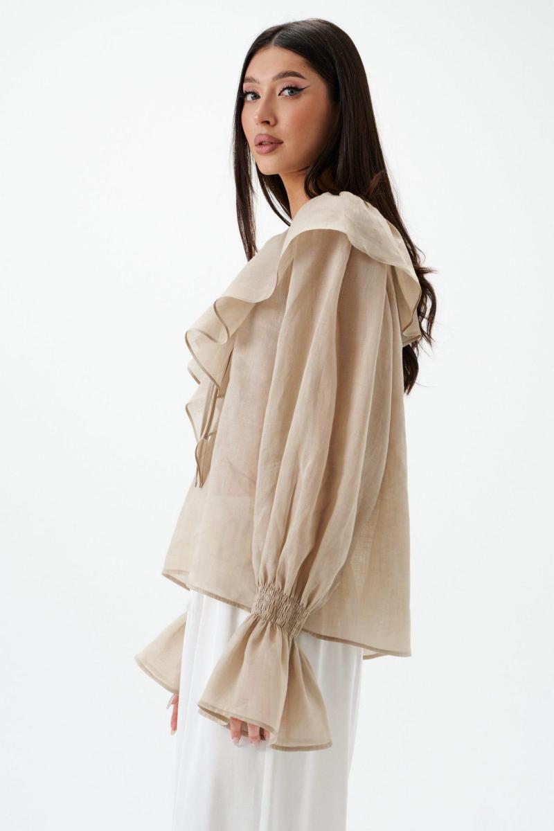Блуза прямого кроя с крупным воротников выполнена из полотна бежевого цвета.Характеристики: прямой крой, V образный вырез горловины, по периметру горловины и по спинке крупный воротник выполнен из ткани основного изделия, рукав втачной, в области запястья по рукаву широкая венгерка, спинка цельнокроеная. Длина по спинке 56, длина рукава 71 см.