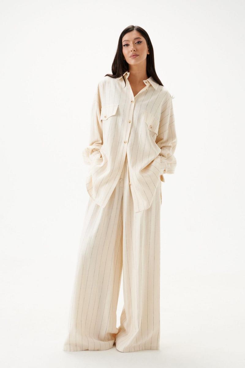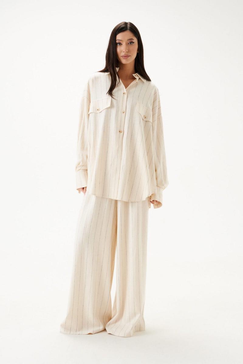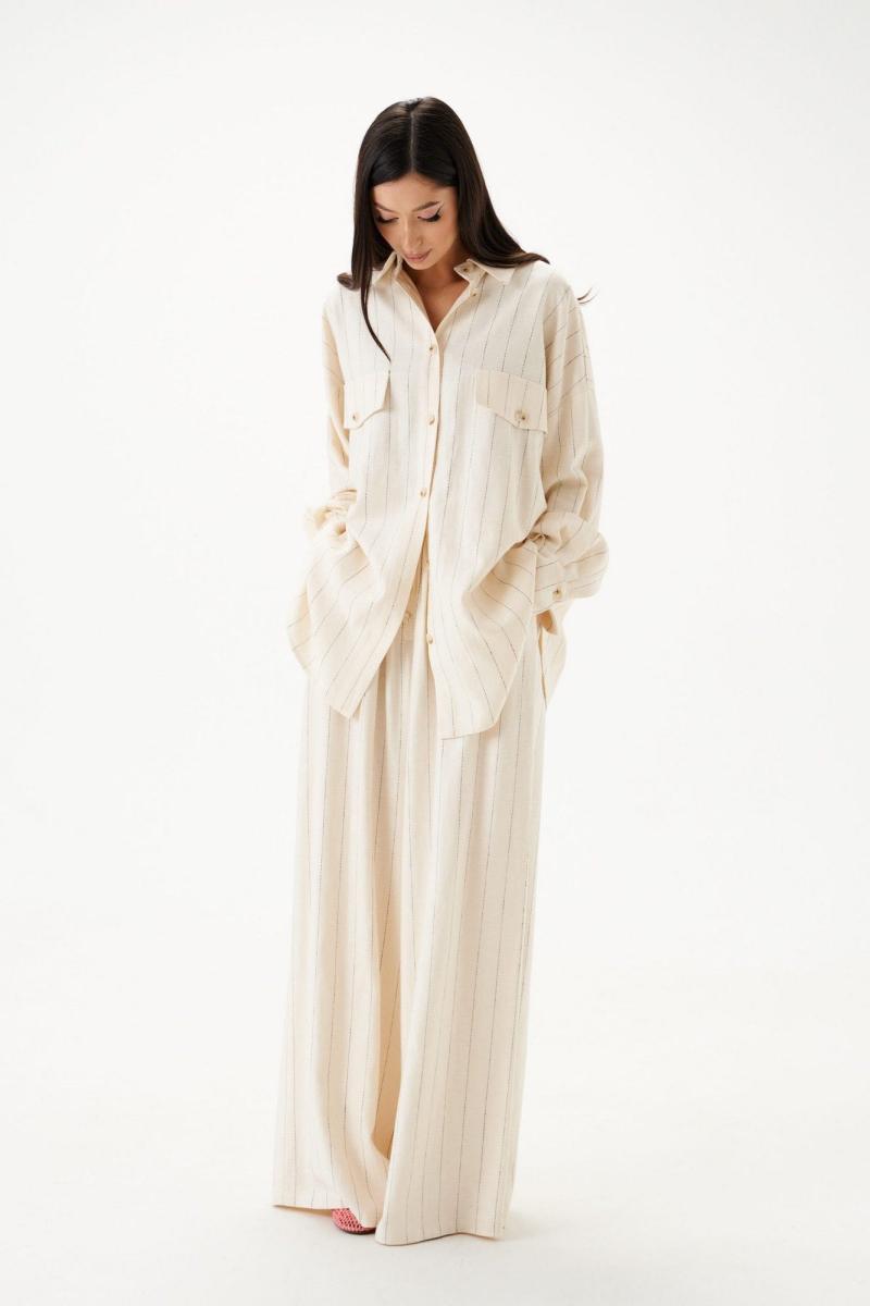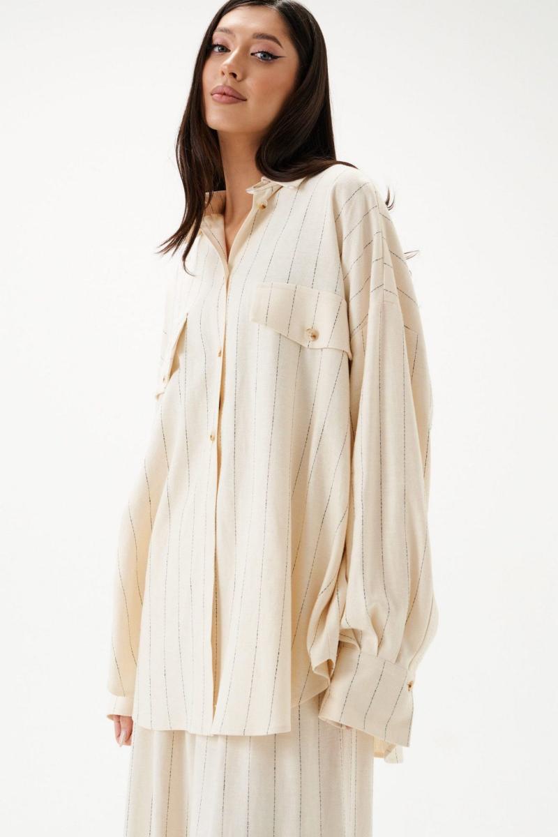 Рубашка прямого свободного кроя. Выполнена из мягкого текстильного полотна. Воротник отложной. Застёжка центральная на пуговицы. По переду на уровни линии груди клапаны - имитация карманов. Рукав спущенный, свободный, с манжетой на пуговице. Длина рукава от края горловины 80 см. Спинка отрезная со сборкой. Длина спинки 75 см