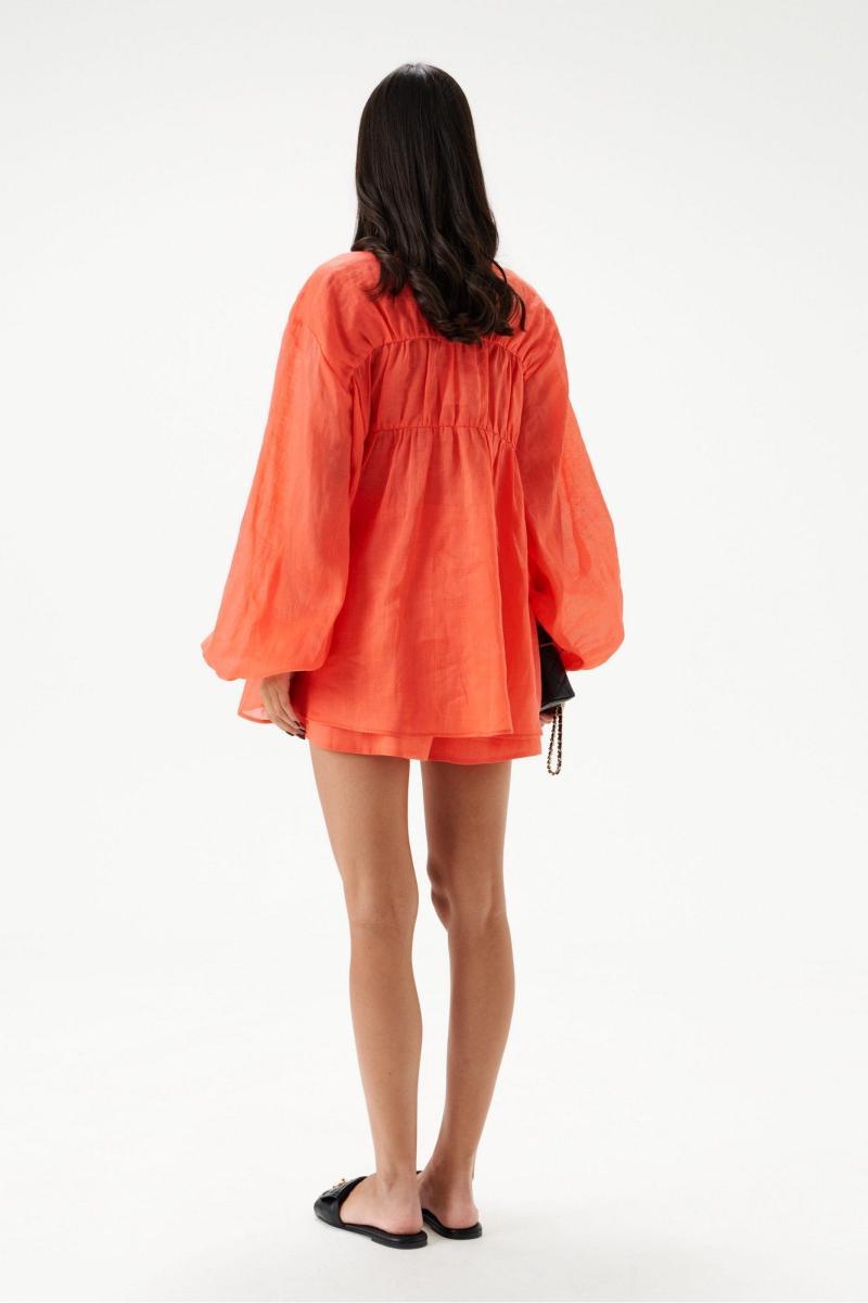Блуза свободного кроя. Выполнена из полупрозрачного полотна рами кораллового цвета. Вырез горловины V-образный. Рукав втачной, спущенный, низ присборен на резинку. По переду выше линии груди и по спинке отрезная деталь со сборкой, по переду с завязками. Спинка с кокеткой. Длина рукава от линии втачивания 64 см. Длина спинки 70 см