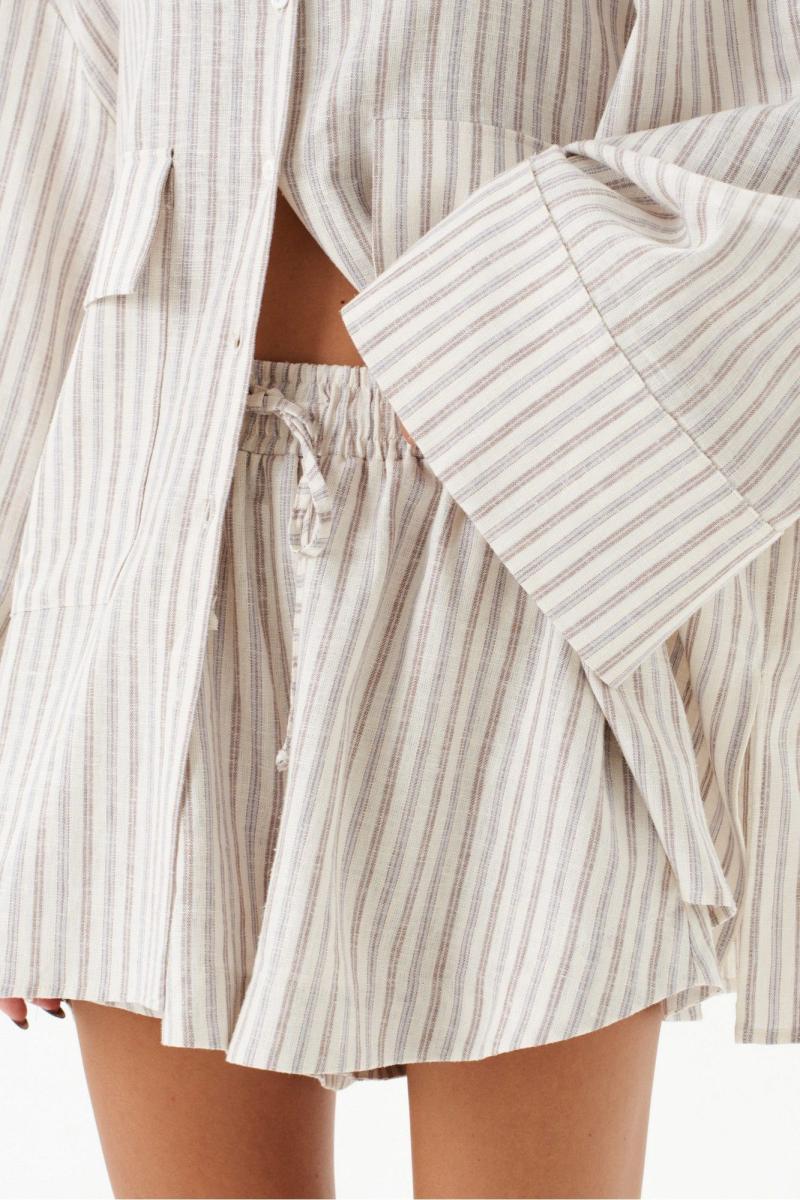 Блузка прямого свободного кроя выполнена из льняного полотнав полоску.Характеристики: прямой свободный крой, отложной воротник, застежка центральная на петли пуговицы, по переду крупные карманы с клапанами, рукав спущен, по низу рукава широкая манжета, спинка отрезная с декоративными складками, в боковых швах разрезы 20см.Длина по спинке 78 см, длина рукава от края горловины 77 см.