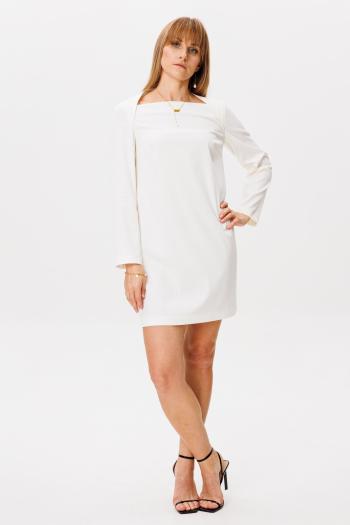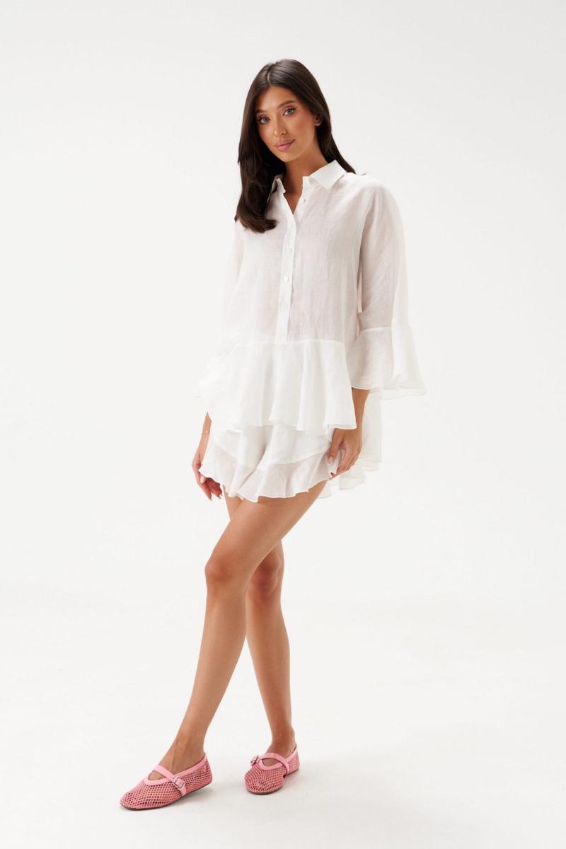 Блузка свободного кроя, выполнена из лёгкого натурального полотна белого цвета – рами. Воротник рубашечного типа, застежка центральная на петли пуговички, крой рукава «летучая мышь». Низ изделия и рукава декорированы воланом из основной ткани изделия. Длина по спинке с учетом волана - 73 см. Длина рукава от горловины - 60 см.