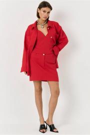 Рубашка прямого свободного силуэта, выполнена их хлопковой, джинсовой ткани, в красном цвете. По переду накладные карманы, застежка на пуговицы. Рукав спущенный, по низу рукав на манжете и пуговице.