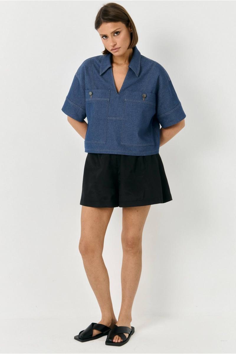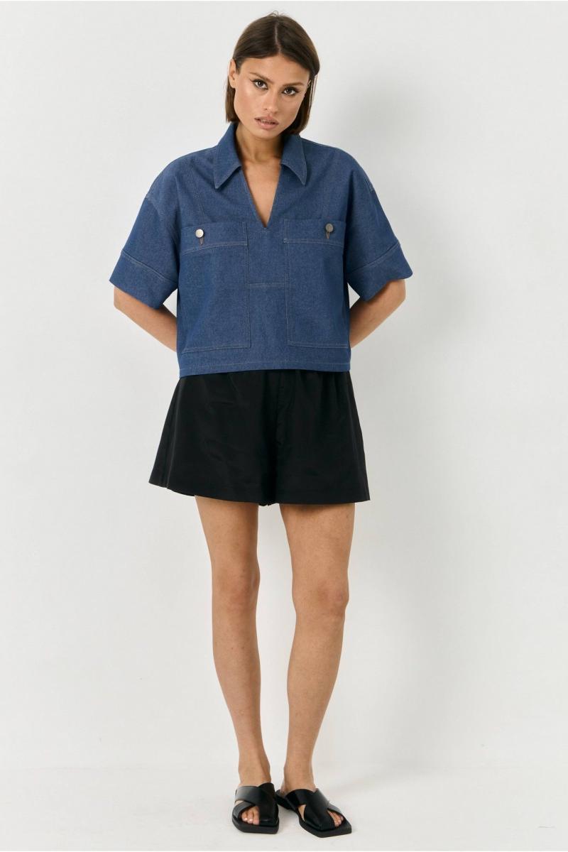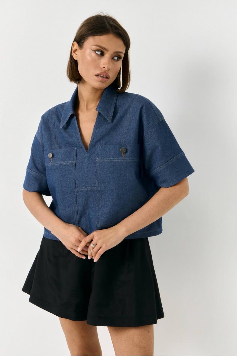 Рубашка прямого свободного кроя из хлопковой джинсовой ткани. Рубашка с V-образным вырезом. По переду накладные карманы. Декоративные швы по изделию.