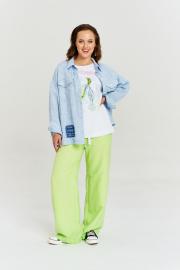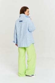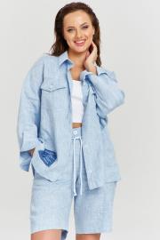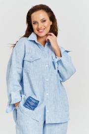 Рубашка из 100% белорусского льна с эффектом стирки, свободного силуэта, с длинным рукавом с манжетами и рубашечным воротником. Спинка удлиненная, с отрезной кокеткой. Перед с застежкой на пуговицы, отрезными кокетками и накладными карманами с клапанами. Изделие декорировано авторскими нашивками из джинса с необработанными срезами.