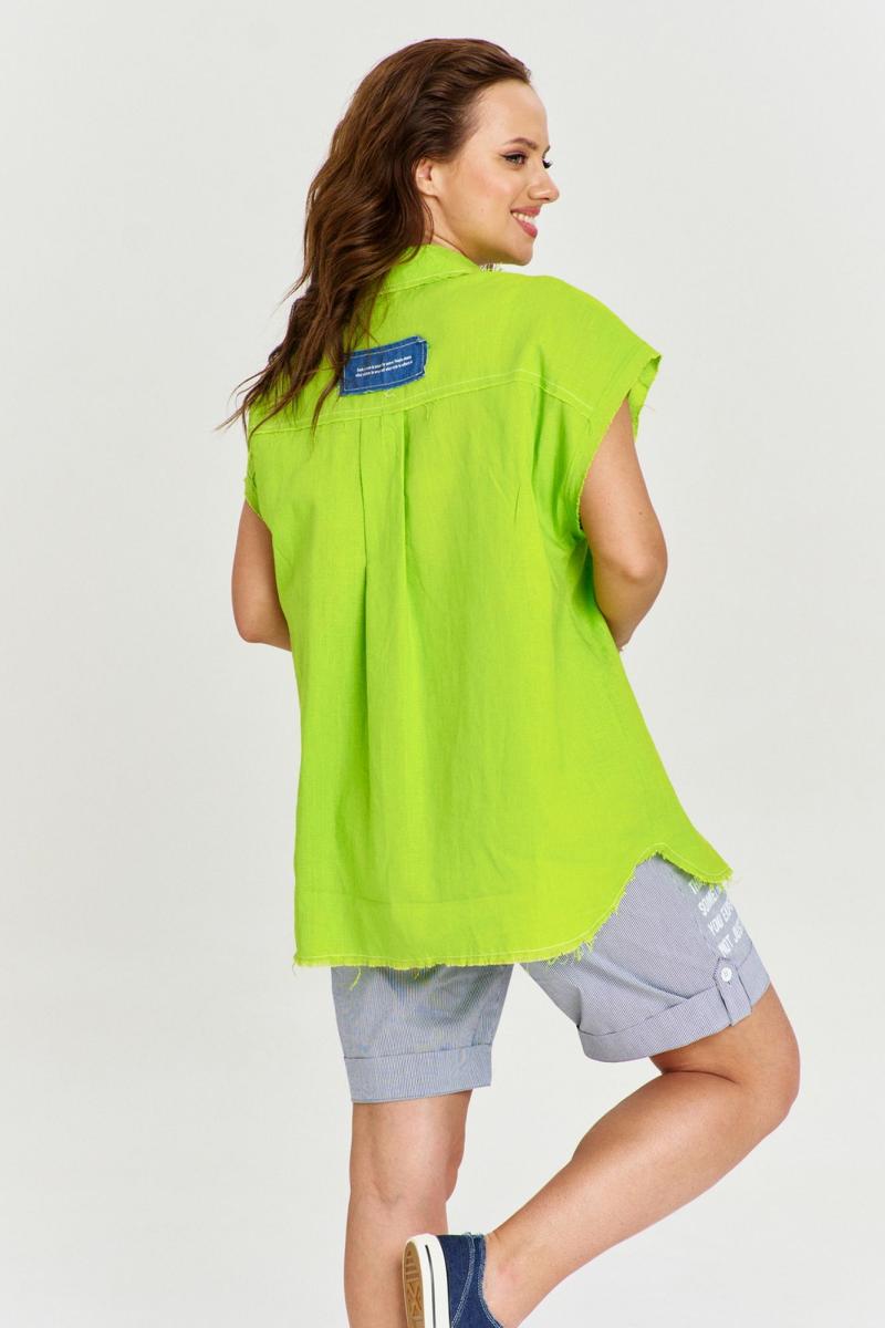 Рубашка из льняной ткани, свободного силуэта, удлиненной спинкой, застежкой на пуговицы спереди и рубашечным воротником. Спинка с отрезной кокеткой и бантовой складкой. Рукав короткий, цельнокроеный. На переде отрезные кокетки и накладные карманы с авторским принтом. Некоторые швы изделия необработаны, при энзимной стирке обретают стильную вытрепанность.