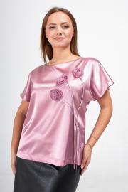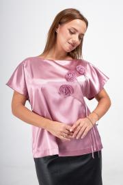 Блузка прямого силуэта с горловиной "лодочка" из комфортной приятной на ощупь шелковистой ткани. Спущенный цельновыкроенный короткий рукав и свободный модный силуэт добавляет легкости и воздушности образу. Аппликации в виде цветов, пришитые к блузке, делают ее еще более яркой и женственной.
