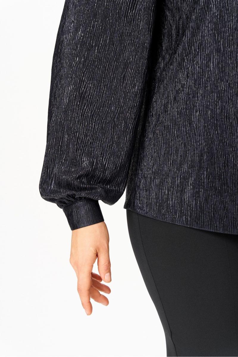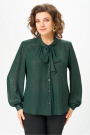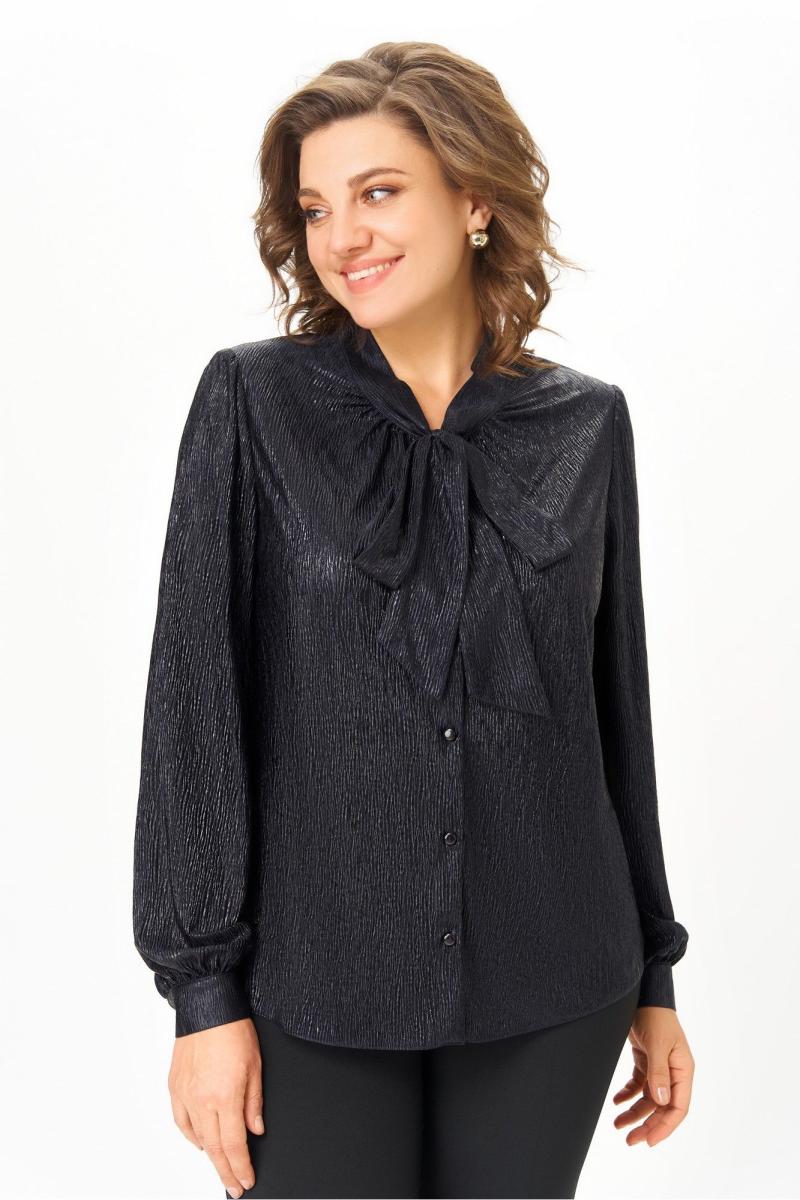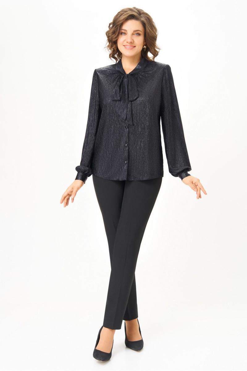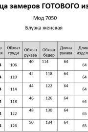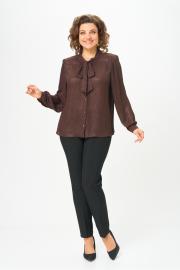Блузка женская прямого силуэта, с центральной застежкой по переду на петли и пуговицы. По горловине переда-легкая сборка, воротник стойка, переходящая в бант. Рукав длинный, со сборкой по окату и по низу, заканчивающейся манжетой, с застежкой на петлю и пуговицу. Длина изделия-67 см, длина рукава-66 см