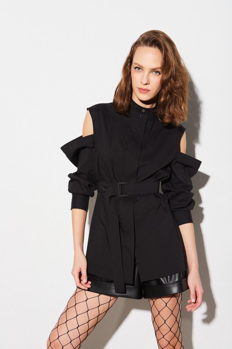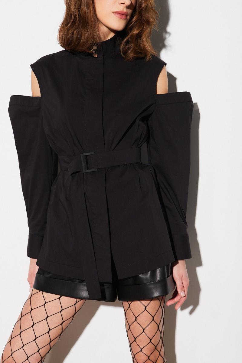 Блузка из ткани платьево-блузочного ассортимента, прямого силуэта, длиной ниже линии бёдер, с рукавами, частично открывающими плечи и воротником-стойкой. Застёжка центральная на декоративную молнию с отлетной планкой от горловины до низа. Стойка с застёжкой на две петли и пуговицы. Низ блузки прямой с высокими разрезами по боковым швам. Рукава со складками по шву притачивания манжет и обтачным верхним краем на уровне середины плеча. Застёжка манжет на две петли и пуговицы. По низу и разрезам прострочена широкая отделочная строчка. На талии расположен съёмный пояс с пряжкой.