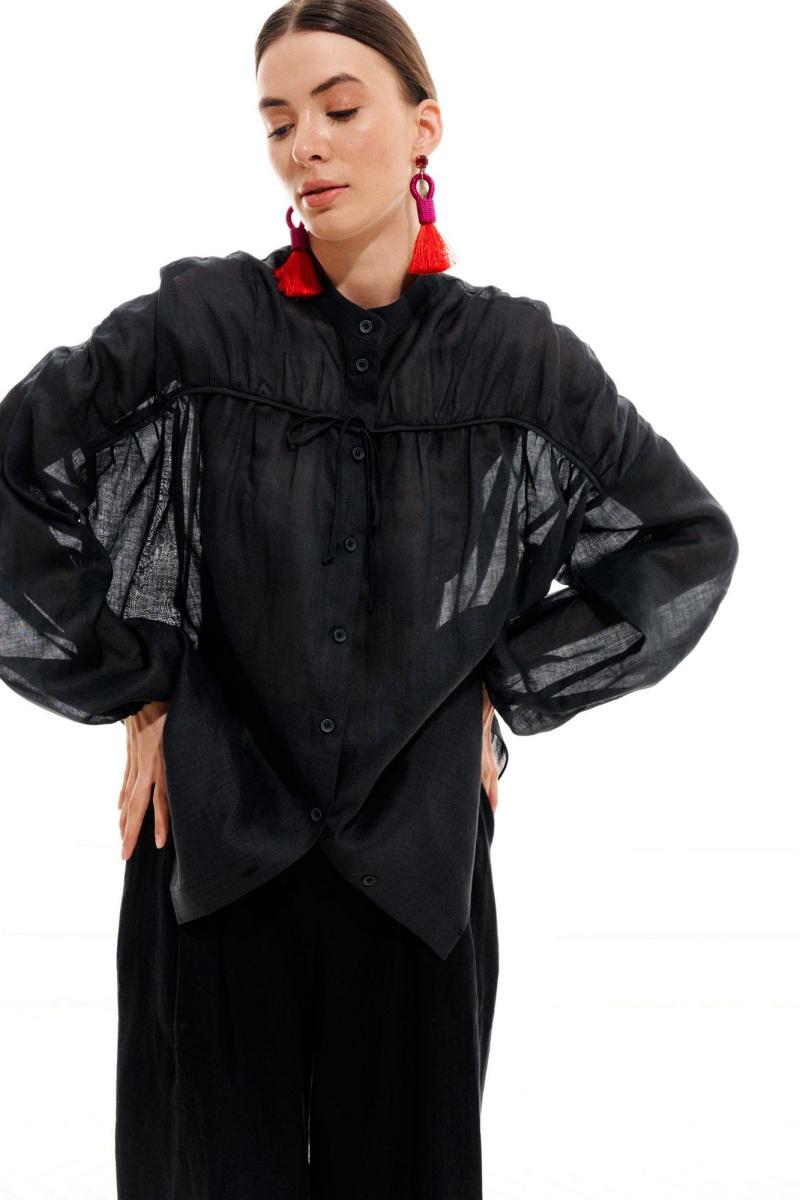 Блузка женская, свободного силуэта, длиной ниже линии бедер из легкой блузочной ткани, со спущенной линией плеча. Перед с центральной цельнокроеной планкой и застежкой на петли, пуговицы и драпированной, декоративной кокеткой, кантом и кулисой из основного материала в шве кокетки. Спинка с отрезной кокеткой, нижняя часть спинки присборена, в шве кокетки кант из основного материала. Рукав одношовный, длинный, низ рукава присборен на резинку. Горловина обработана воротником стойкой. Низ блузки фигурный.