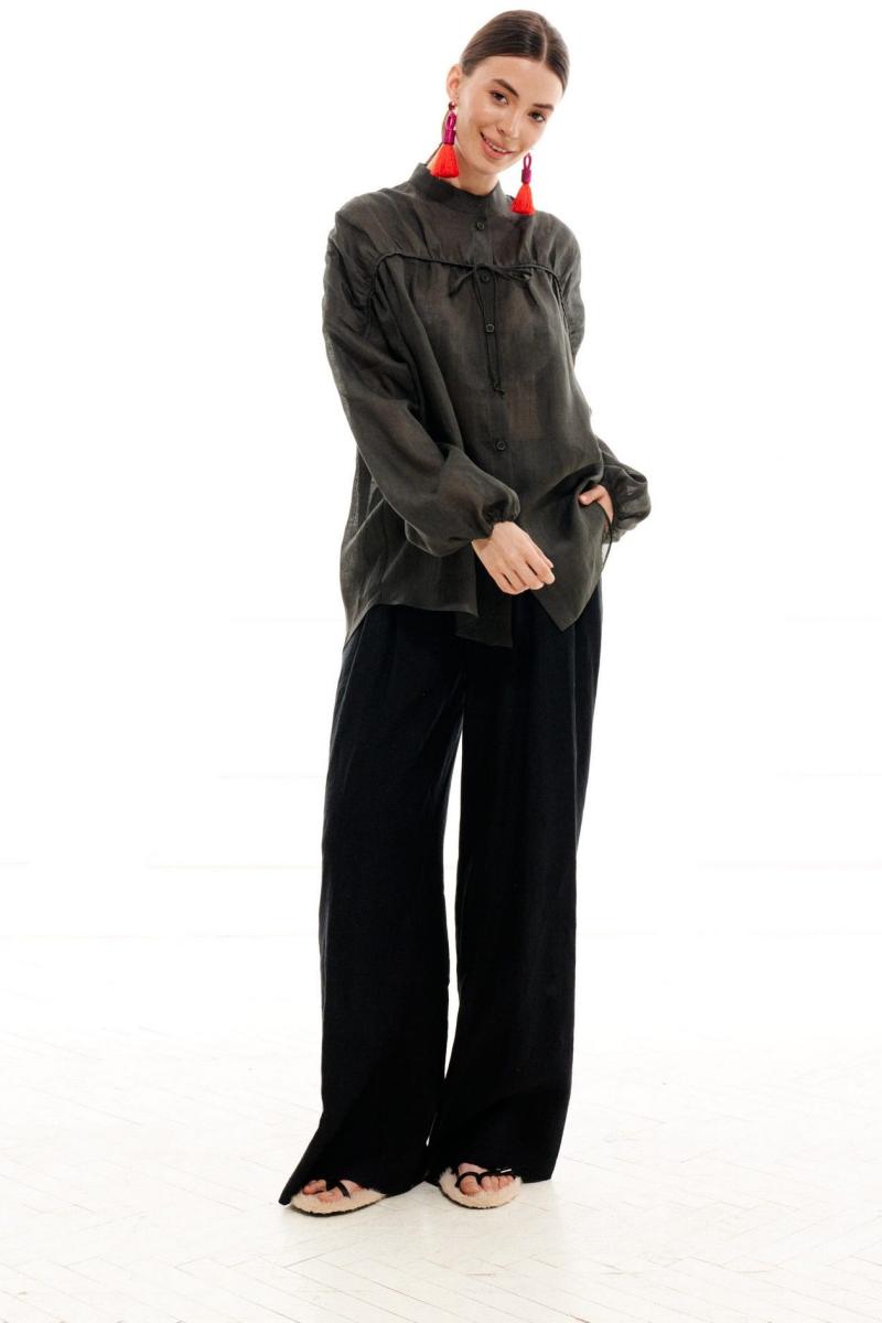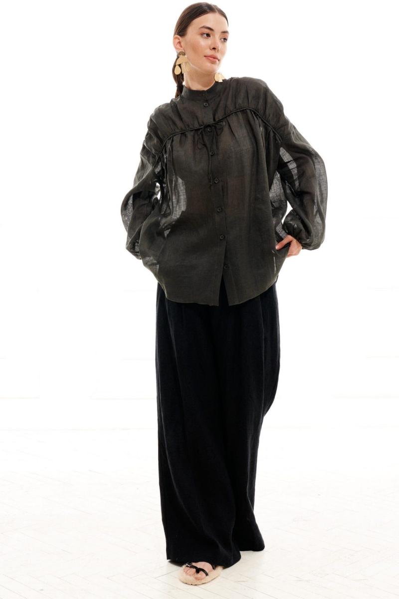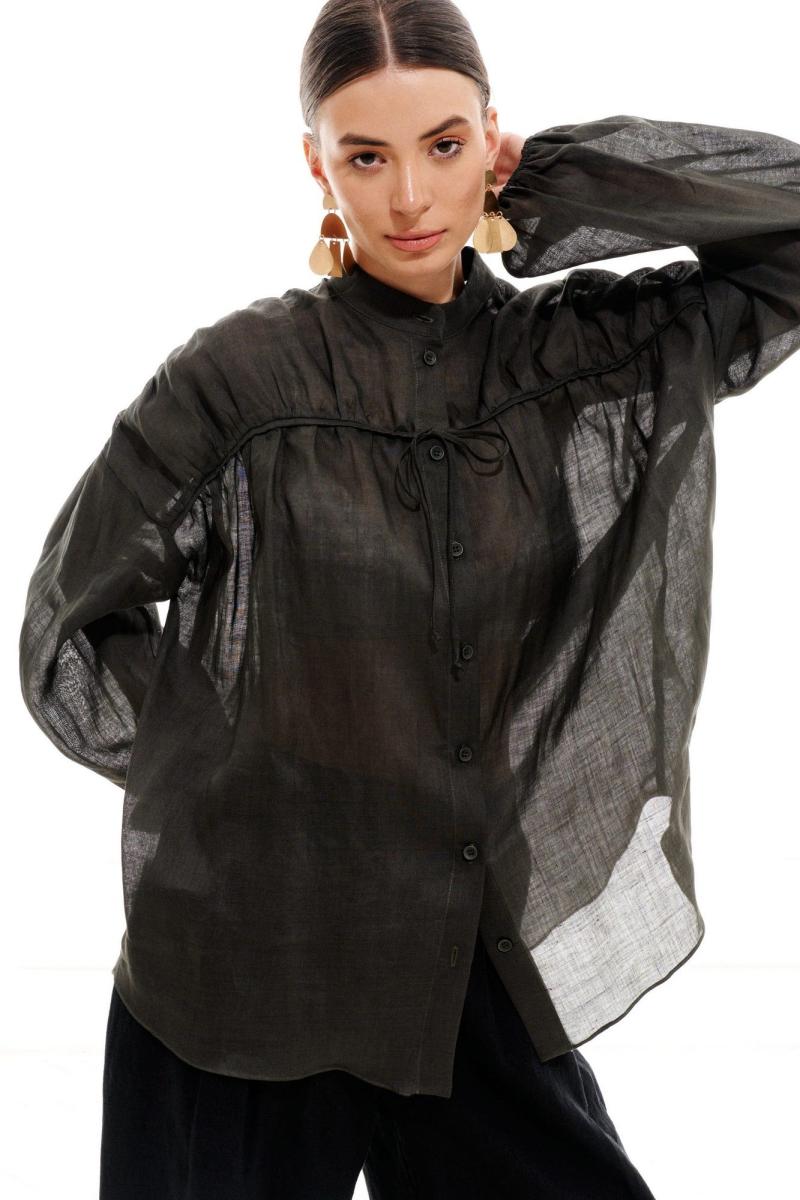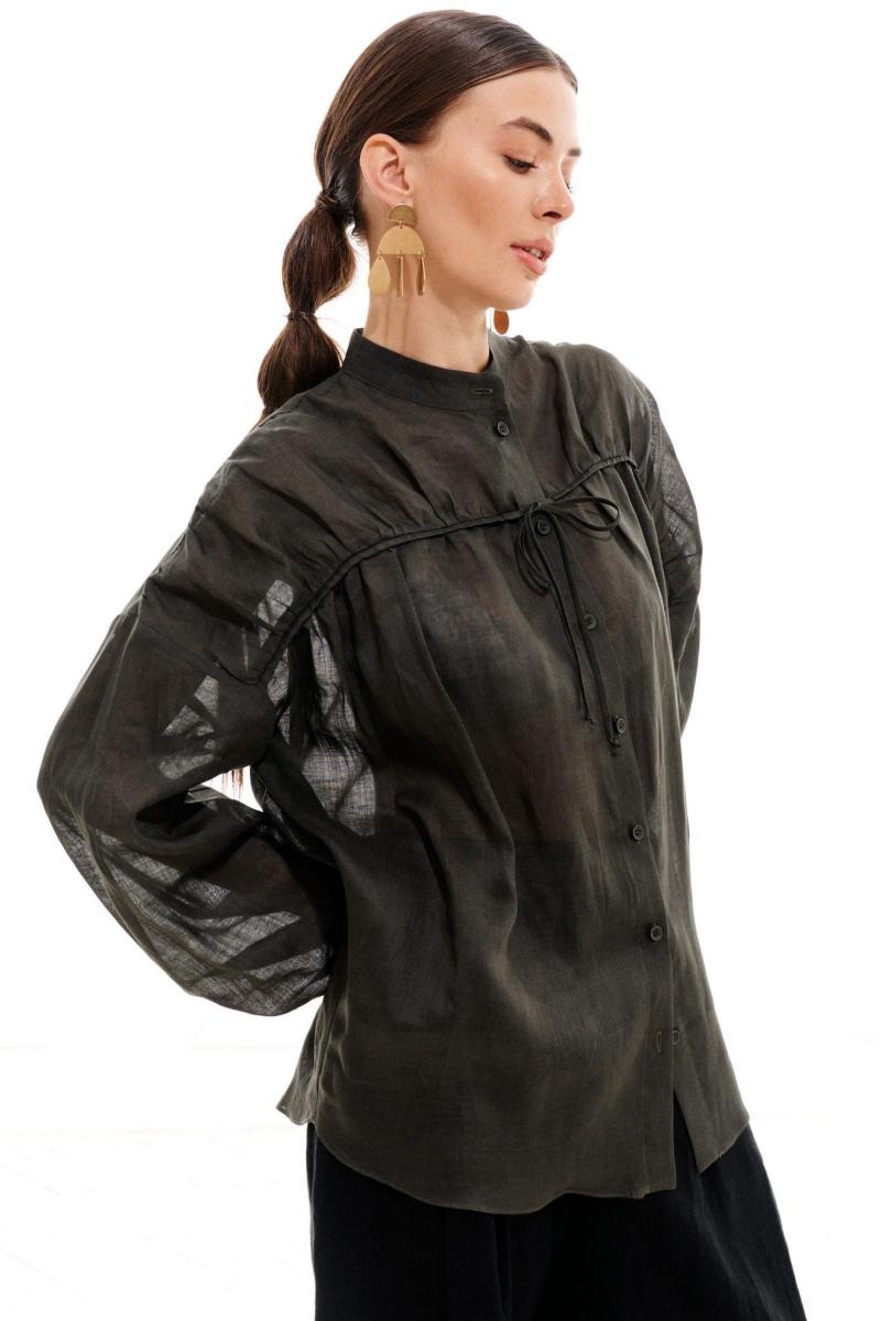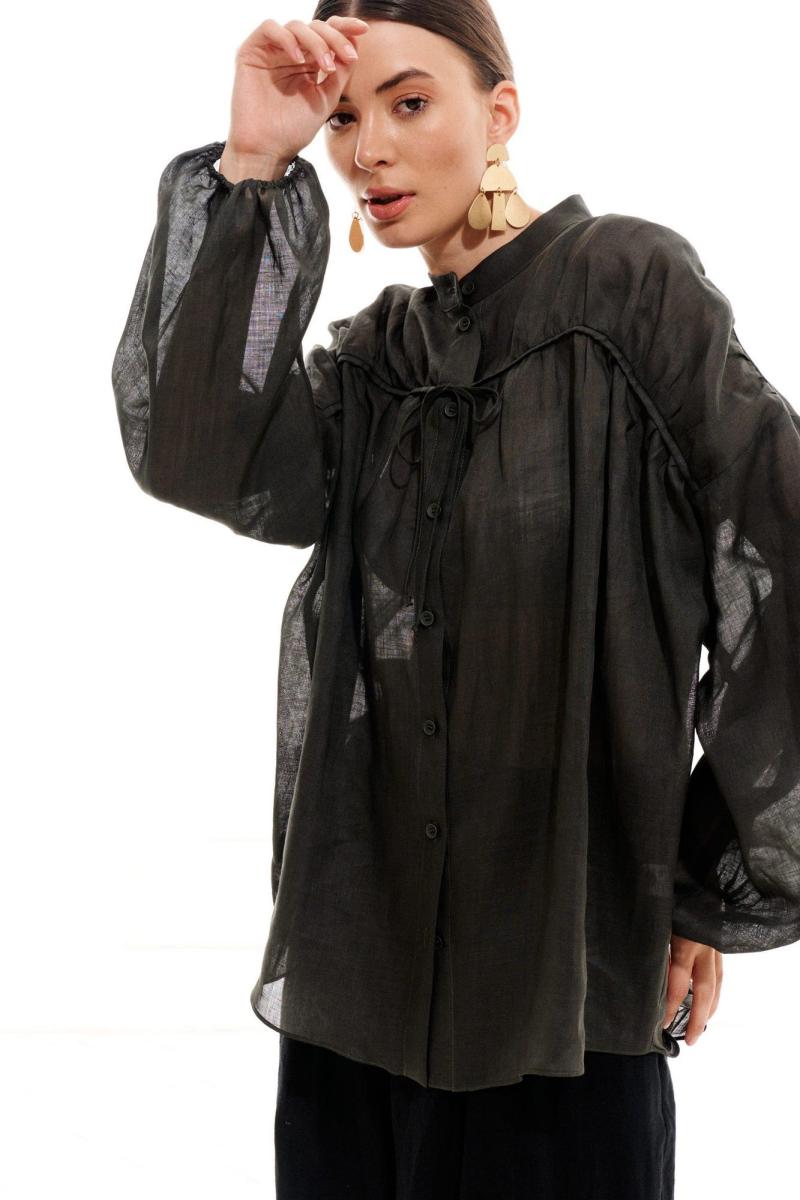 Блузка женская, свободного силуэта, длиной ниже линии бедер из легкой блузочной ткани, со спущенной линией плеча. Перед с центральной цельнокроеной планкой и застежкой на петли, пуговицы и драпированной, декоративной кокеткой, кантом и кулисой из основного материала в шве кокетки. Спинка с отрезной кокеткой, нижняя часть спинки присборена, в шве кокетки кант из основного материала. Рукав одношовный, длинный, низ рукава присборен на резинку. Горловина обработана воротником стойкой. Низ блузки фигурный.