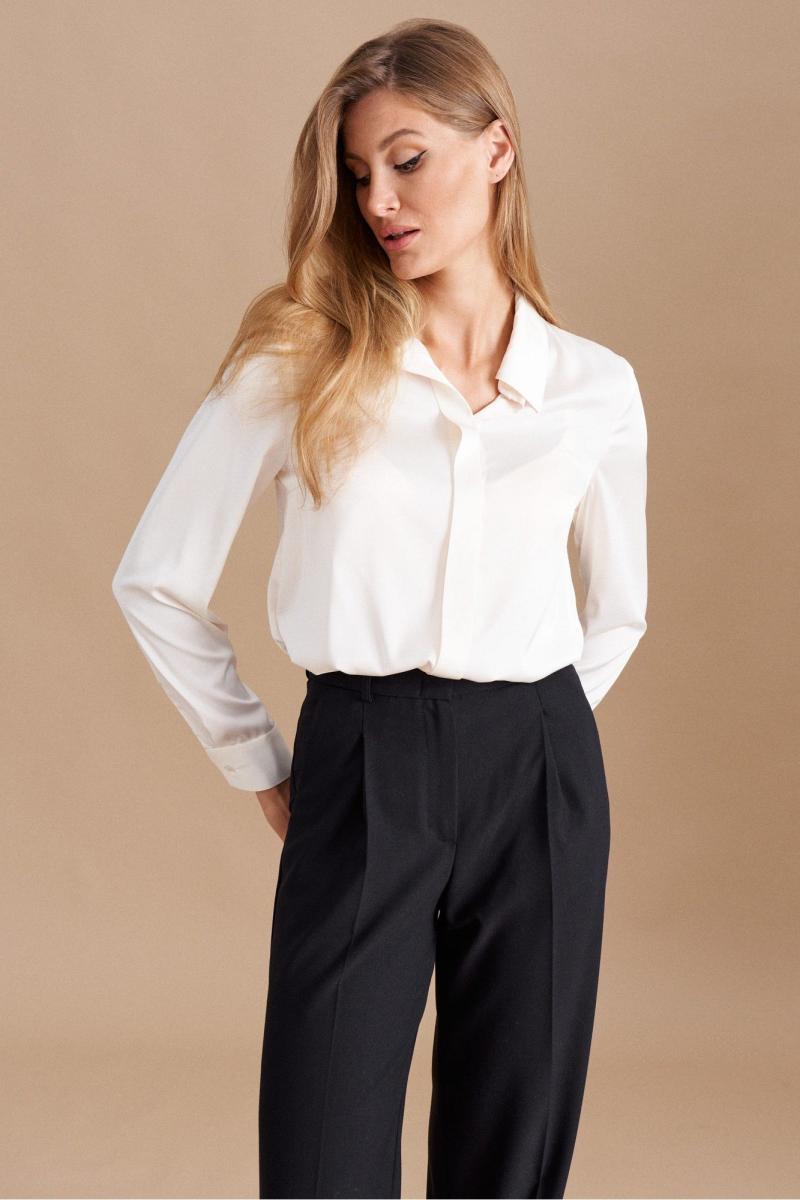 Блуза полупригающего силуэта из плательно- блузочной ткани. Застежка по переду оригинальная потайная на петли, пуговицы. Воротник отложной на стойке. Рукав длинный втачной оформлен притачной манжетой. Длина изделия до линии бедер.