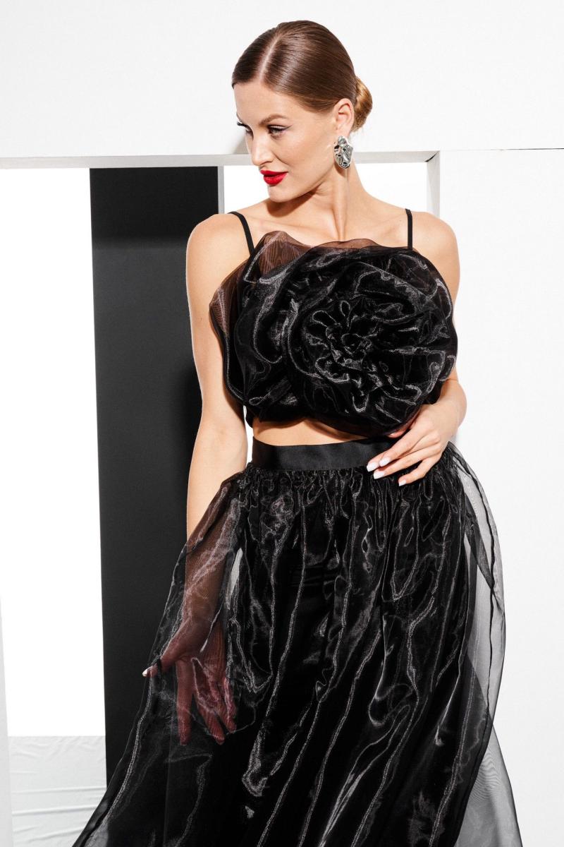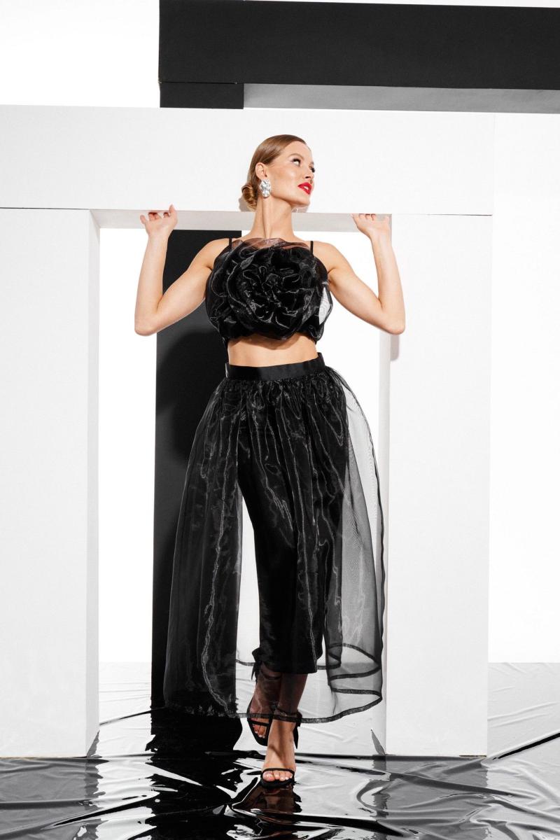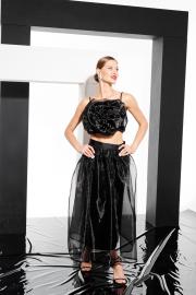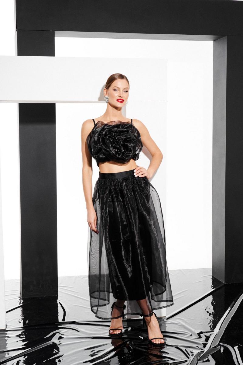Блузка женская, укороченная, приталенного силуэта, длиной чуть выше линии талии, корсетного типа . Перед с деворативным эллементом в виде цветка. Спинка с рельефами, в среднем шве спинки застежка на декоративную разъемную молнию. Блузка на регулируемых бретелях и подкладке.