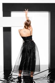Блузка женская, укороченая, приталеного силуэта, длиной чуть выше линии талии, корсетного типа . Перед разрезной. Спинка с рельефами, в среднем шве спинки застежка на декоративную разъемную молнию. Блузка на регулируемых бретелях и подкладке.