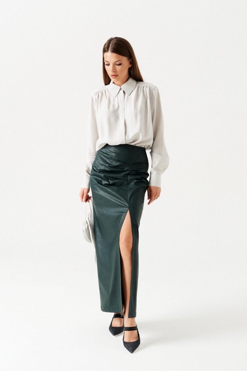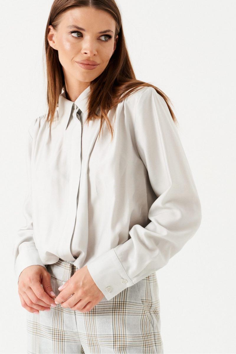 Блузка прямого силуэта с центральной застежкой на петли и пуговицы. Воротник рубашечный, отложной, на притачной стойке. По переду и спинке отрезная кокетка. По верхнему краю детали переда выполнена сборка. Боковые швы заканчиваются разрезом. Рукав втачной, длинный, с отрезной манжетой, застежкой на петли и пуговицы.