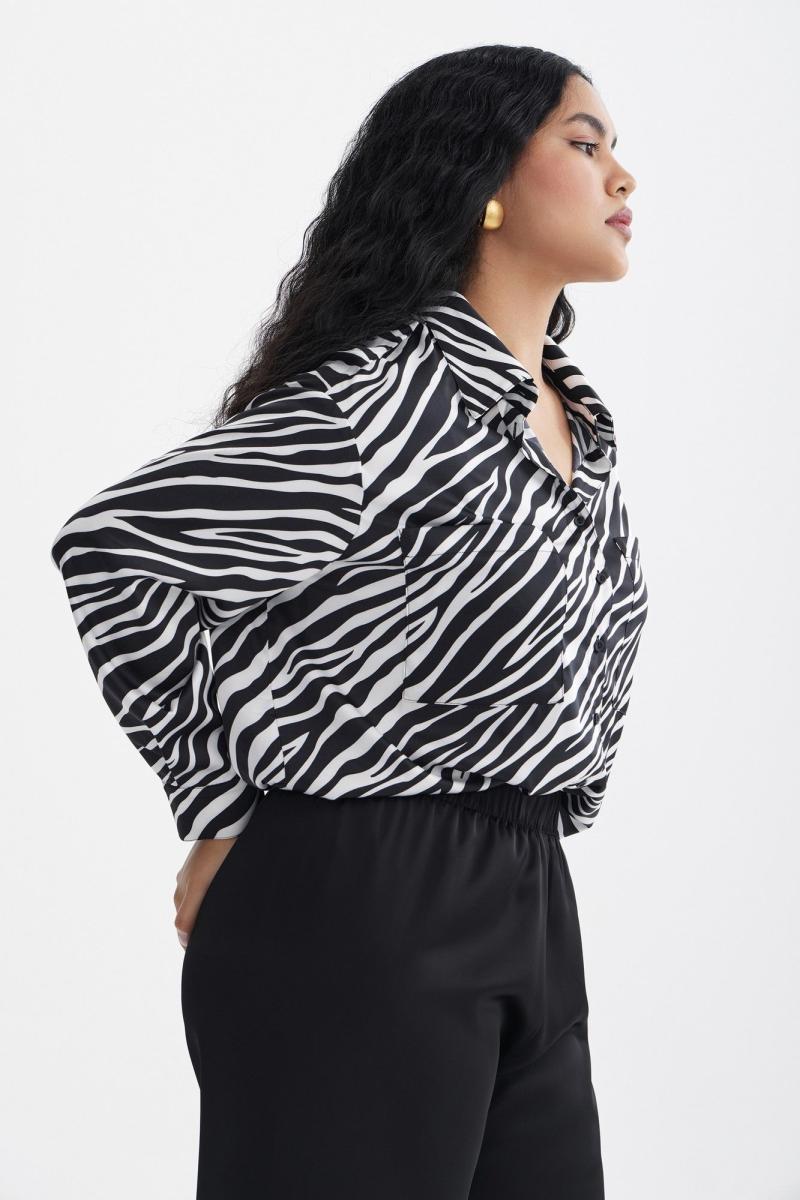 Блузка с центральной застежкой на петли и пуговицы, втачным воротником с отрезной стойкой. На уровне груди расположены накладные карманы. Боковые швы с разрезами. Плечо спущенное. Рукав втачной, длинный, с отрезной манжетой, застегивающейся на две петли и пуговицы.
