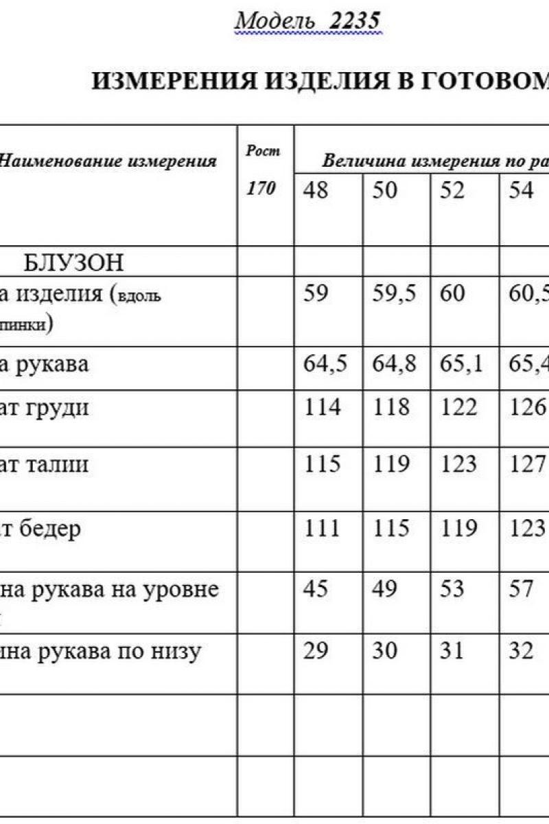 Цветовая гамма для верха, подкладки, фурнитуры, отделки: блузон выполнен в одной цветовой гамме. Планка горловины, нижняя деталь блузона- из трикотажа, контрастного цвета.