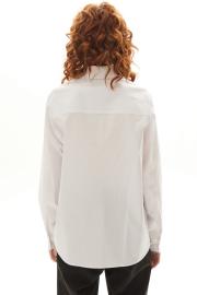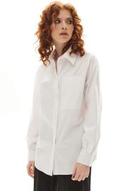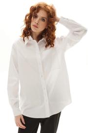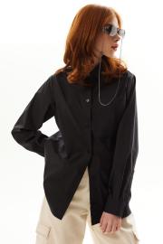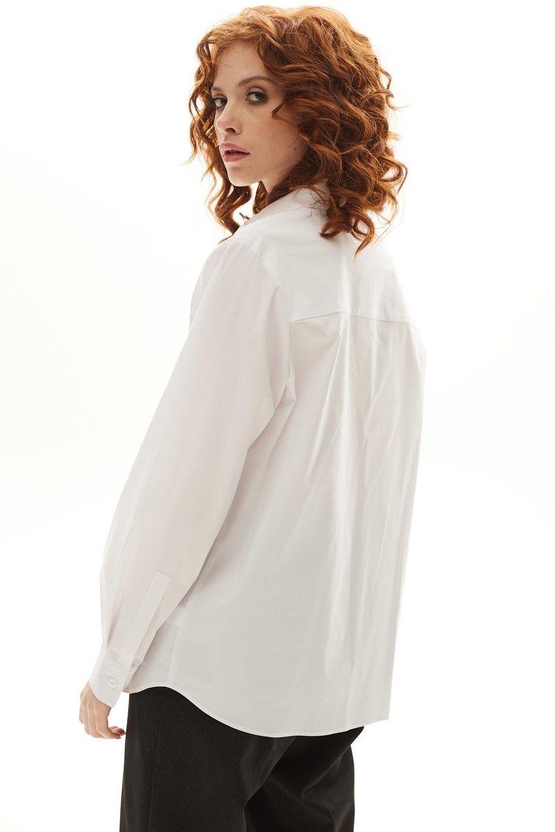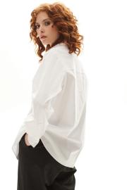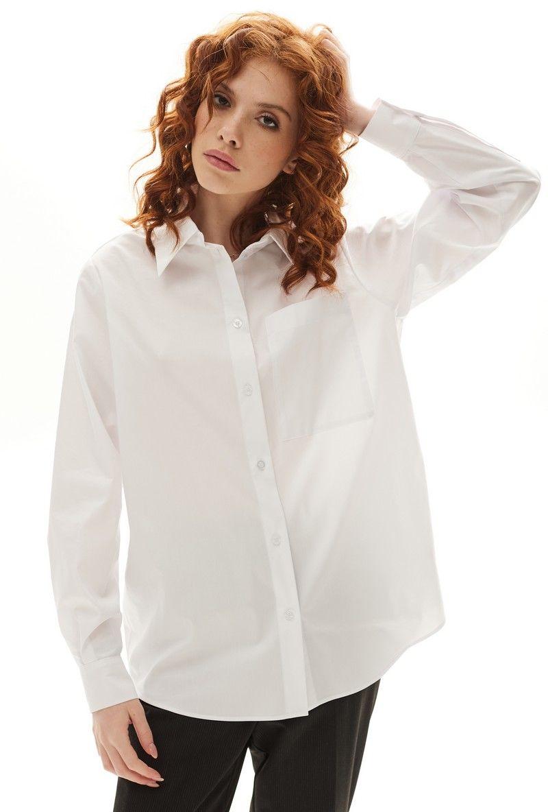 Блузка с застежкой на петли и пуговицы, втачным воротником с отрезной стойкой. По правой полочке- накладной карман. Спинка с отрезной кокеткой. Низ блузки фигурный. Рукав втачной, длинный, с отрезной манжетой.