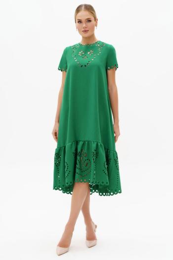 Блузка женская свободного силуэта из блузочной ткани. Воротник стояче-отложной, застежка — планка на кнопки. По спинке кокетка и складка. Плечо спущенное, рукав длинный со складками, внизу высокий манжет с застежкой на кнопки. По переду накладные карманы с нашивкой на одном из них. По боковым швам внизу высокие разрезы.