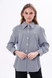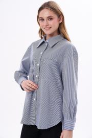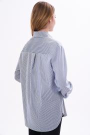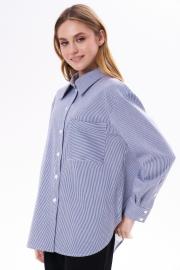 Базовая, хлопковая рубашка в полоску. Линия плеча спущена. Рукав длинный на манжете. По переду накладной карман и застёжка на пуговицы. Низ изделия фигурный