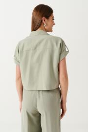 Блуза прямого силуэта из вискозной ткани. Характеристики: Прямой силуэт. По переду накладные карманы со встречной складкой с клапаном. Горловина оформлена воротником. Линия плеча спущенная. Пройма оформлена отложной манжетой, застёгивающаяся на петлю-пуговицу. Застёжка фронтальная на петли-пуговицы. Горловина оформлена воротником.