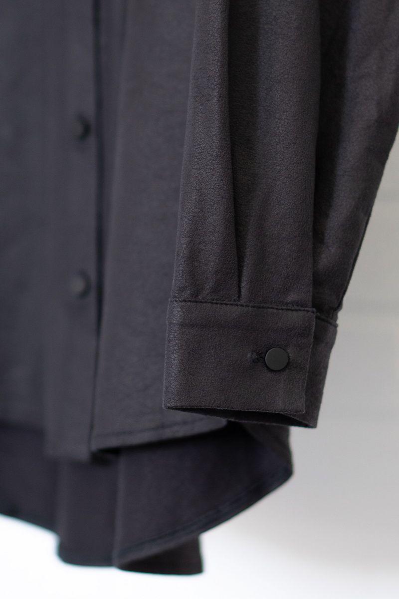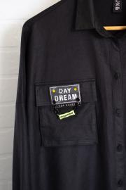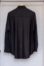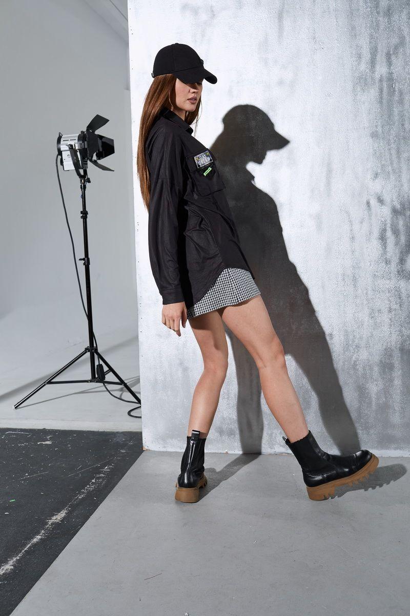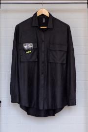 Рубашка прямого свободного кроя с центральной застёжкой на кнопки.Перед с накладными объёмными карманами'портфель'.Спинка с кокеткой.Рукав обработан притачной манжетой на кнопку.Воротник рубашечного типа. длина изделия -81см длина рукава от плеча-60см