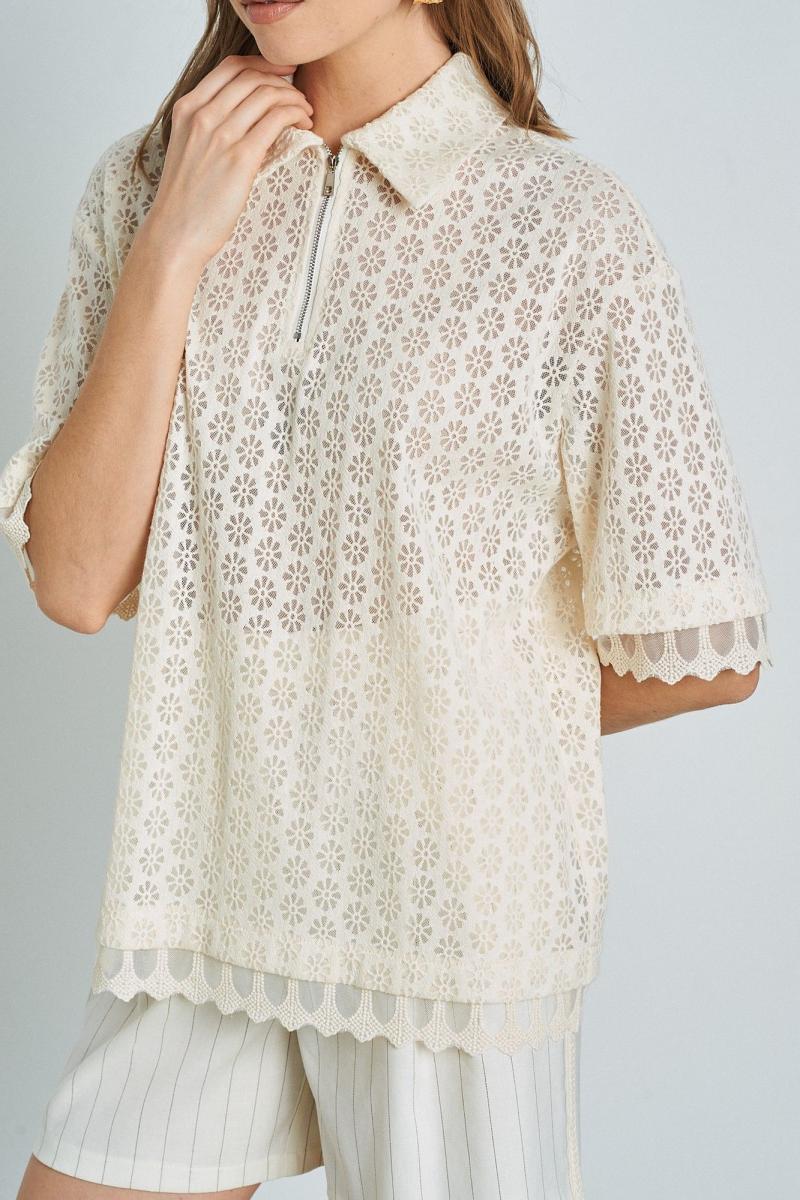 Поло из трикотажного кружева в трендовом оттенке BUTTER YELLOW. Низ изделия и рукава декорированы тесьмой. Длина поло 67 см. Состав 65% хлопок, 30% ПЭ, 5% спандекс