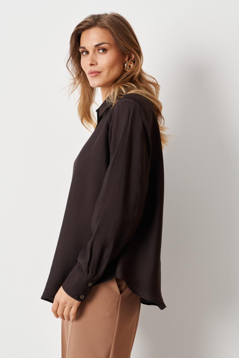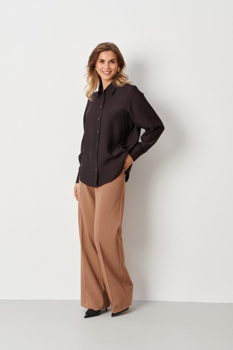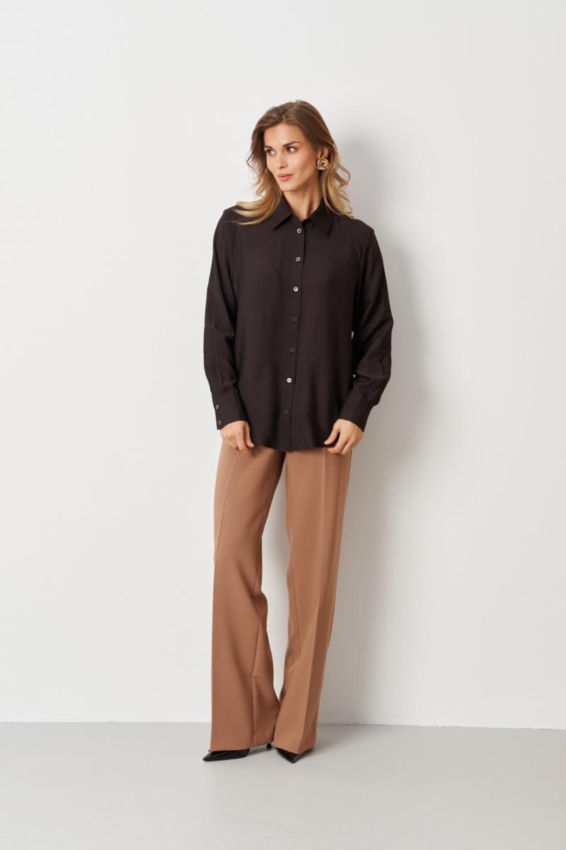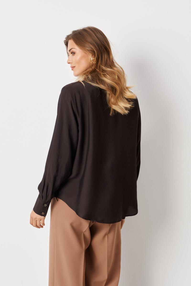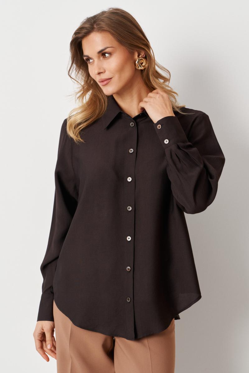 Эта стильная женская блузка чёрного оттенка идеально подойдет для повседневной носки. Выполненная в прямом силуэте, она обеспечивает комфорт и свободу движений. Ткань поливискозная, струящаяся, что придает изделию легкость и изящность. Перед украшен центральной бортовой застежкой на обметанные петли и пуговицы, а низ изделия выполнен с закругленным краем, добавляя изящества образу. Горловина оформлена классическим рубашечным воротником, а рукава завершены притачными манжетами с застежками на две обметанные петли и пуговицы — практично и стильно. Эта очень легкая и практичная блузка станет отличным выбором для ежедневных образов, сочетая комфорт с элегантностью и привлекательностью.