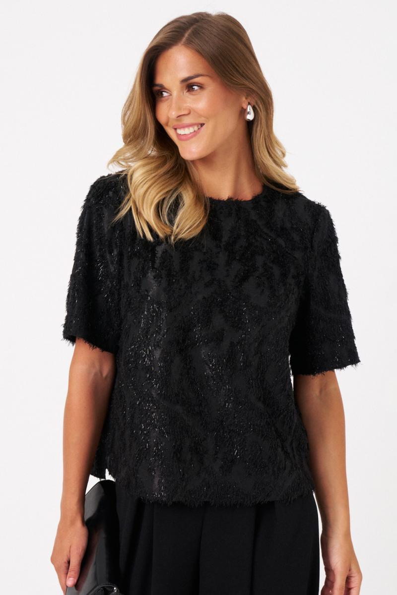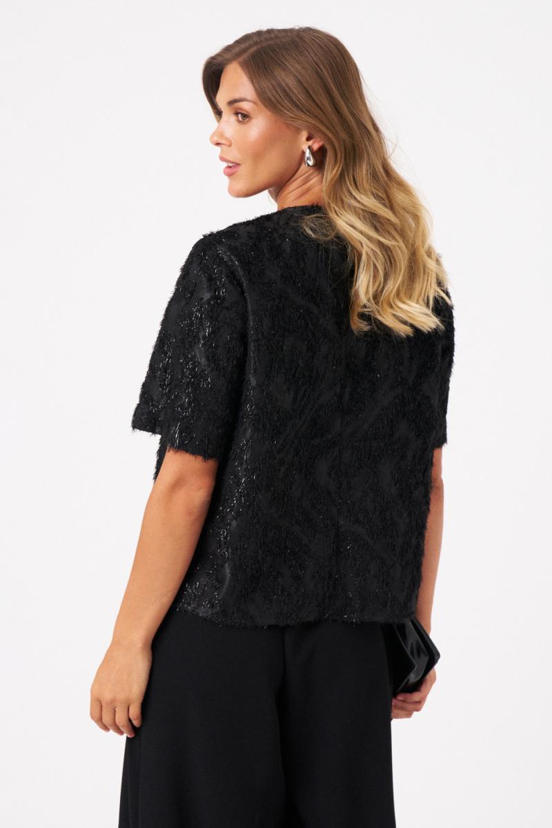 Это женская блузка из поливискозной ткани с лёгки блеском и ворсом. Модель выполнена в прямом силуэте и отличается оригинальным материалом, напоминающим травку, что придает ей свежий и необычный внешний вид. Перед с двумя нагрудными вытачками, которые подчеркивают линию груди и обеспечивают аккуратную посадку. Спинка с средним швом и застежкой-капелькой обеспечивает удобство надевания и комфорт в носке. Горловина чуть расширена, что добавляет образу легкости и элегантности. Короткие втачные рукава делают блузку практичной и универсальной для повседневных образов. Блузка выполнена на трикотажной подкладке, что обеспечивает дополнительный комфорт. Блузка для повседневной либо торжественной носки. Благодаря черному цвету она отлично подходит для создания стильных и комфортных повседневных луков.