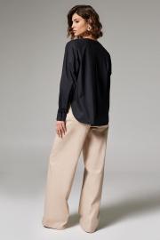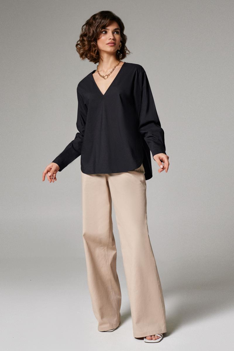 Блуза женская из хлопковой ткани для повседневной носки. Блуза свободная с длинным рукавом. Горловина V- образная. Рукава оформлены манжетой. Низ закругленный. По спинке изделия встречная складка. 42 Блузка: Длина изделия - 67см, Длина рукава - 57см, Ширина плеча - 14.3см, Ширина по груди - 55см, Ширина по низу - 54см, Ширина рукава - 24.4см; 44 Блузка: Длина изделия - 67см, Длина рукава - 57см, Ширина плеча - 14.5см, Ширина по груди - 57см, Ширина по низу - 56см, Ширина рукава - 25см;