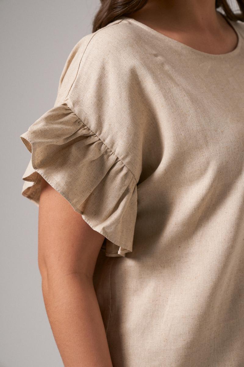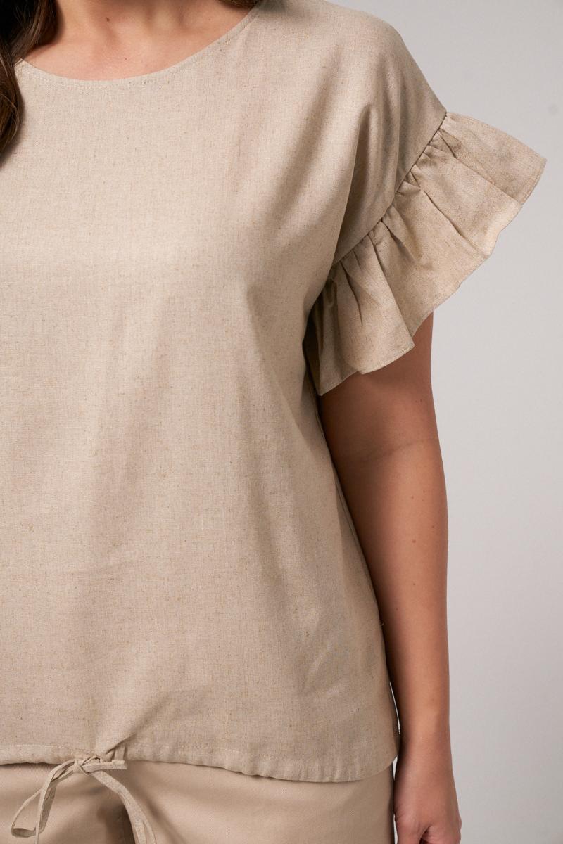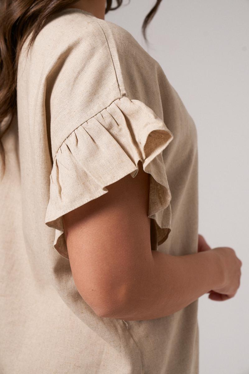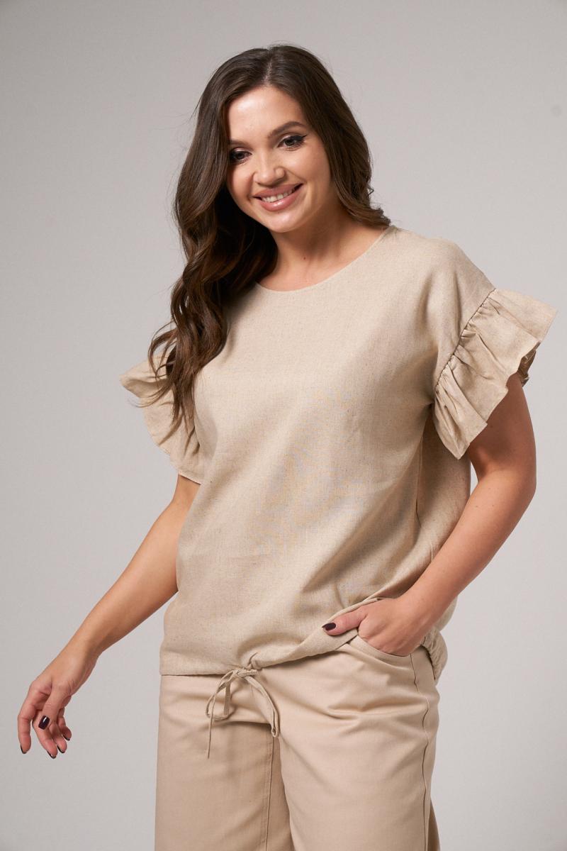Блуза женская из льняной ткани для повседневной носки. Горловина круглая, пройма оформлена сборкой. По низу изделия кулиса.