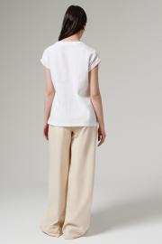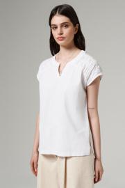 Блуза женская из хлопковой ткани – незаменимая одежда для жарких дней. Блуза прямого слуэта. Линия плеча слегка спущена. В области плеча имеются фигурные кокетки, которые присобраны на резинке и создают эффект буфов. Горловина круглая обработана стойкой, с V-образным вырезом по переду. Низ блузки прямой, спинка чуть длиннее переда. По боковым швам разрезы. Летняя блуза из натурального хлопкового полотна поможет вам создавать интересные повседневные образы. Модель скроена в чуть прямом фасоне, который подчеркнет достоинства вашей фигуры. Нарядная женская блузка привлекает внимание оригинальной формой выреза горловины.