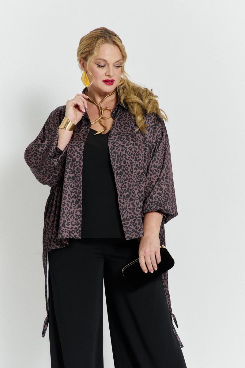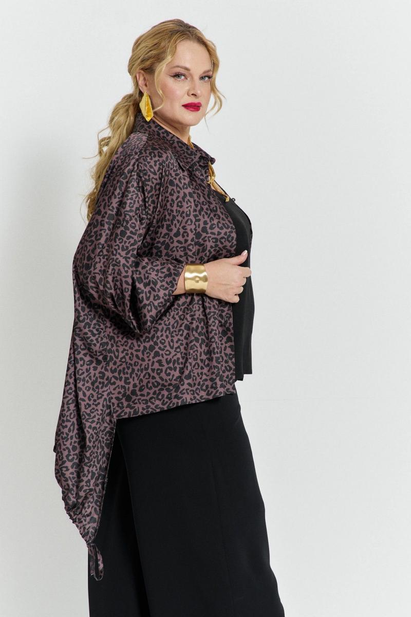 Объёмная блуза с мягкой линией плеча, рубашечным воротником на отрезной стойке, с кулисой по низу спинки. Застёжка на пуговицы, рукава на манжетах без застёжки. Длина по спинке ок. 80 см, ипеоеди ок. 69 см. Длина рукава от нормали ок. 66см.