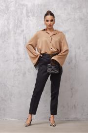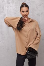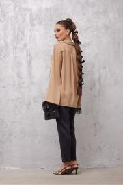 Блузка прямая. Застежка по переду на петли и пуговицы. Воротник рубашечный. Рукав прямой, слегка расширен книзу. По низу рукава отделка «перья». По спинке кокетка и складка.