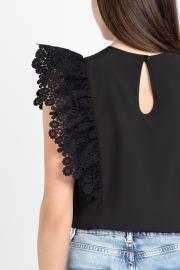 Блуза женская полуприлегающего силуэта. Передняя часть и спинка с рельефами. В рельеф по переду и спинке вставлена рюша. Рюши выполнена из кружева. Горловина переда и спинки окантованы. Спинка с капелькой и застежкой на навесную петлю и пуговицу. Пройма окантована. Длина изделия (р.44, 46, 48): 59 см. Длина изделия (р.50, 52, 54): 61 см. Уход: ручная стирка при температуре не выше 30 С.