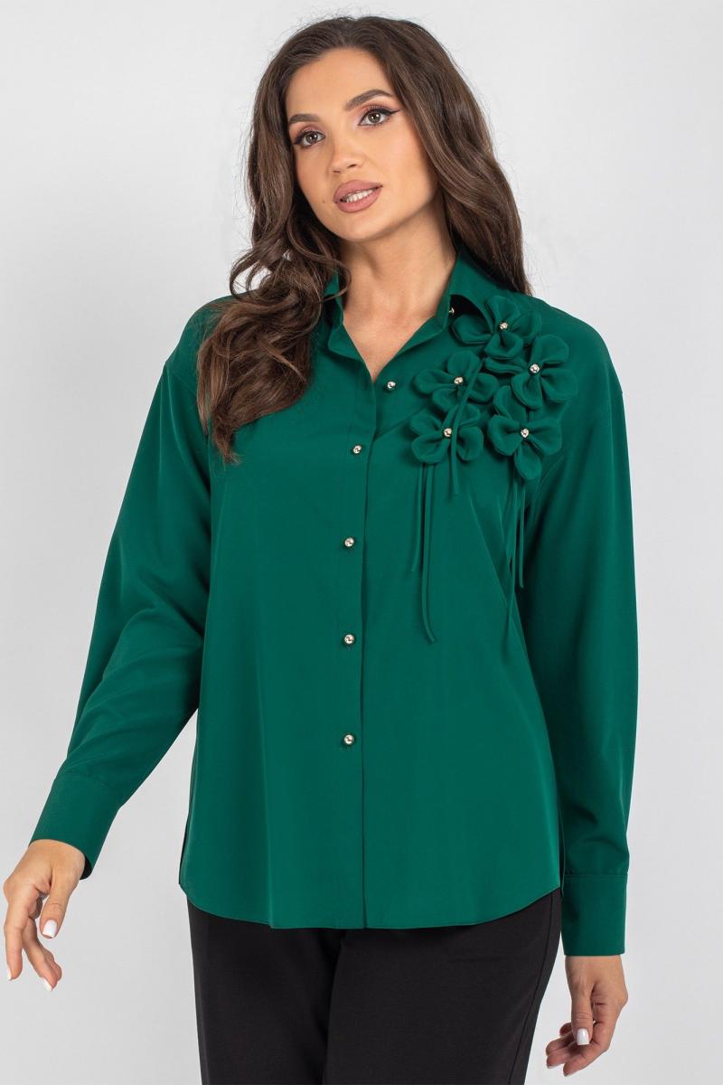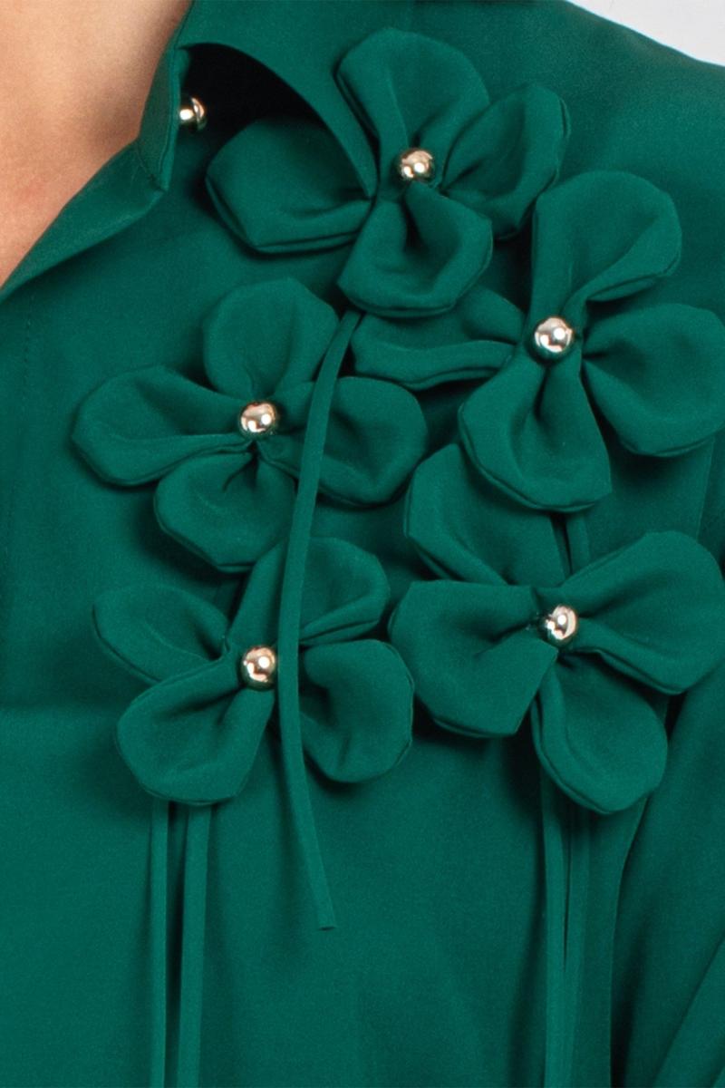 Блузка женская, прямого силуэта со спущенным плечом.  Перед из двух частей с центральной бортовой застежкой на 6 петель и пуговицу. Отделочным элементом блузки является 5 цветков, настроченные пуговицами.  Спинка цельная.  Рукав с притачной манжетой, застегивающейся на 1 петлю и пуговицу.  Воротник рубашечного типа с отложной стойкой. Уход: бережная стирка при температуре не выше 30°С.