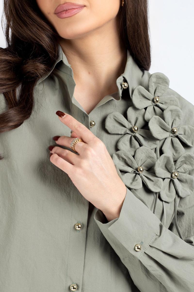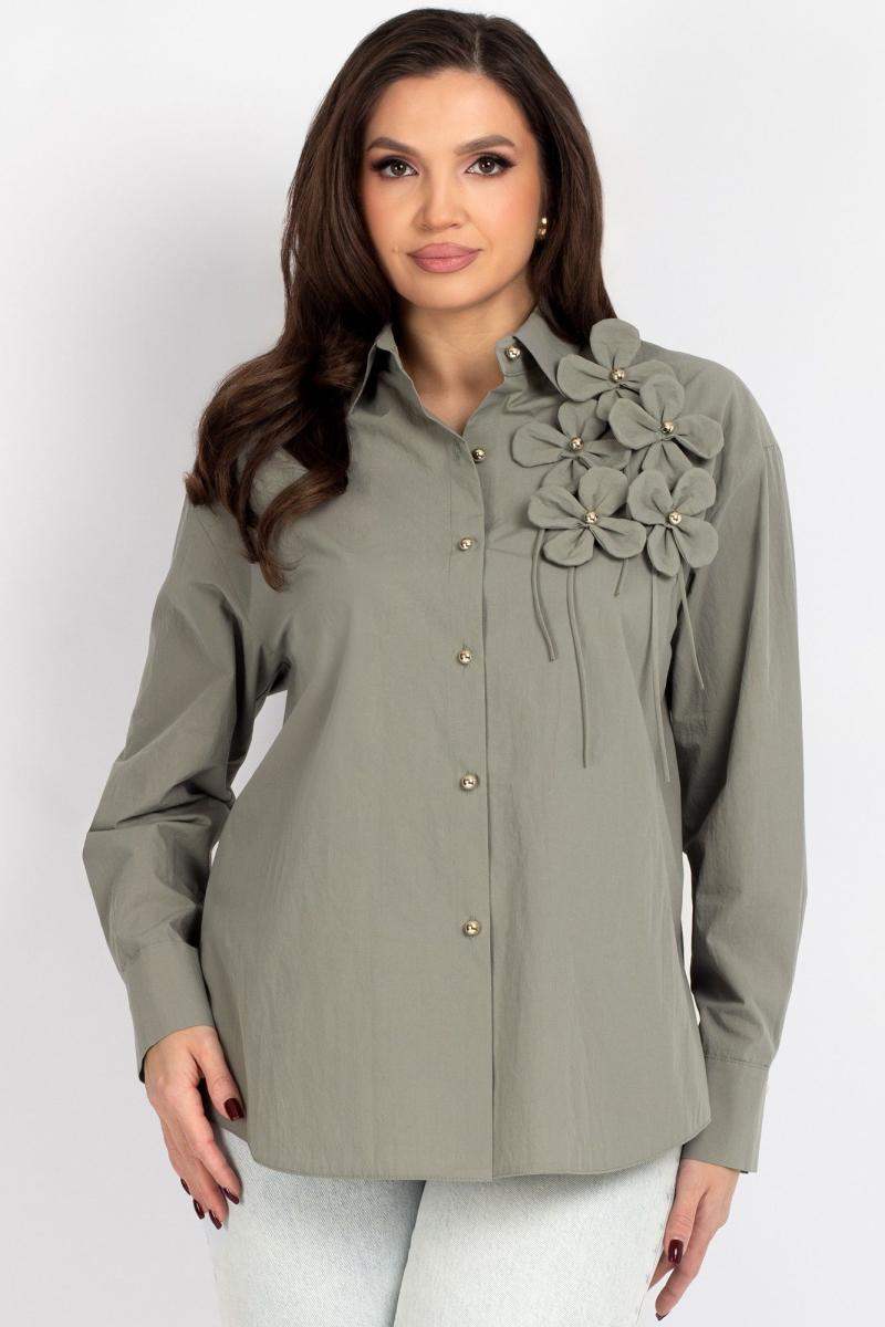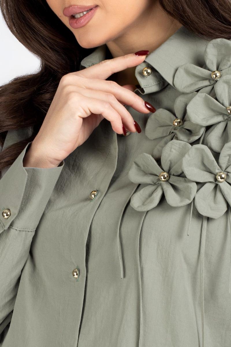 Блузка женская, прямого силуэта со спущенным плечом.  Перед из двух частей с центральной бортовой застежкой на 6 петель и пуговицу. Отделочным элементом блузки является 5 цветков, настроченные пуговицами.  Спинка цельная.  Рукав с притачной манжетой, застегивающейся на 1 петлю и пуговицу.  Воротник рубашечного типа с отложной стойкой. Уход: бережная стирка при температуре не выше 30°С.