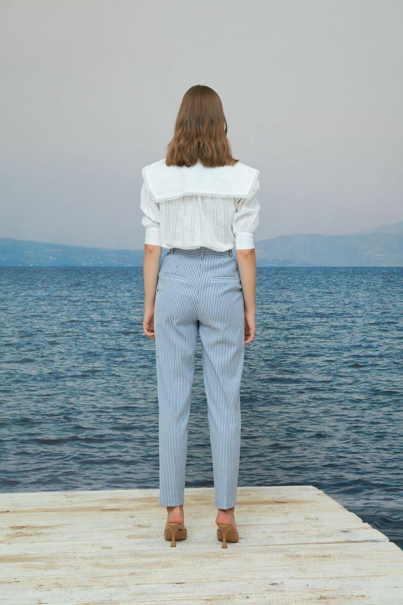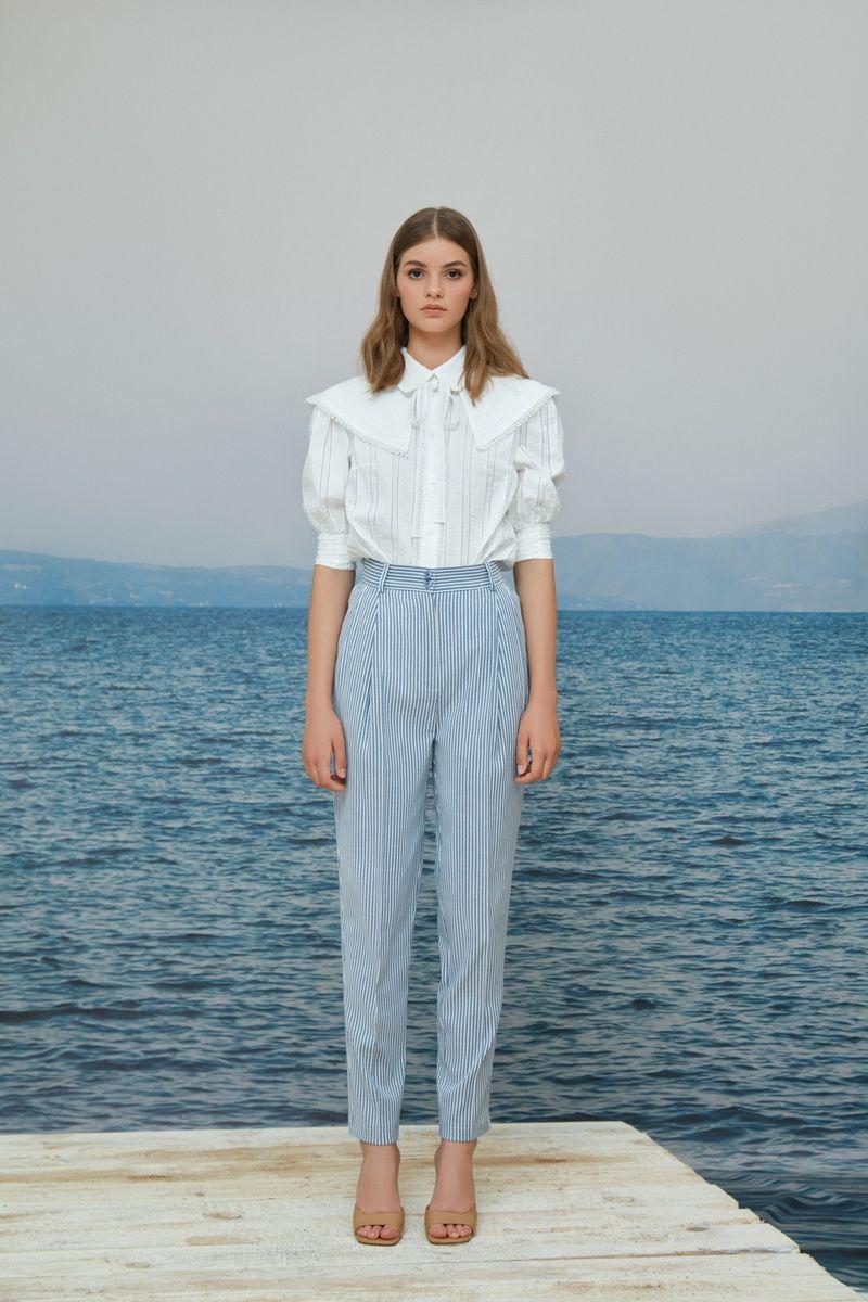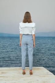 Брюки из костюмно-плательной ткани, прямые, на притачном поясе. Застежка брюк в верхней части среднего шва передних частей на тесьму-молнию, две петли и пуговицы по концам пояса, пояс пятью шлевками. Передние части брюк с заутюженными кантами, боковыми карманами, обработанными в швах отрезных бочков. Задние части брюк с талевыми вытачками, прорезными карманами с листочкой с втачными концами, заутюженными кантами.