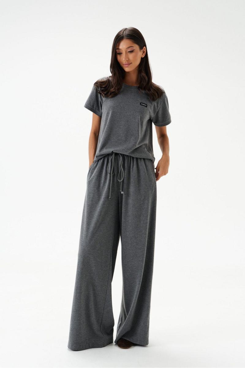Брюки прямого, свободного кроя выполнены из трикотажного полотна.Характеристики: прямой крой, пояс на резинке с кулиской, в боковых швах карманы. Длина брюк 109 см.