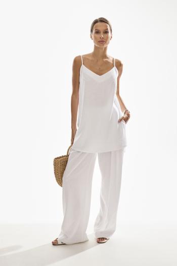 Шорты свободного кроя, выполнены из лёгкого натурального полотна белого цвета – рами.Пояс на резинке, есть подкладка, по низу шорт нашита рюша из ткани основного изделия. Длина по боковому шву с учетом рюши - 32 см
