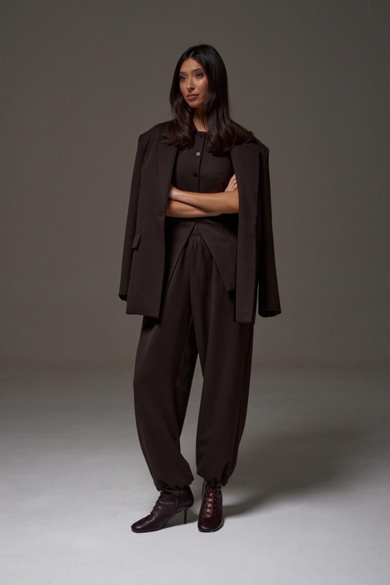 Брюки свободного кроя. Выполнены из плотной текстильной ткани шоколадного цвета. Пояс на резинке. Застёжки нет. В боковых швах карманы. Низ брючины на резинке с фиксатором (регулируется). Длина брюк 100 см