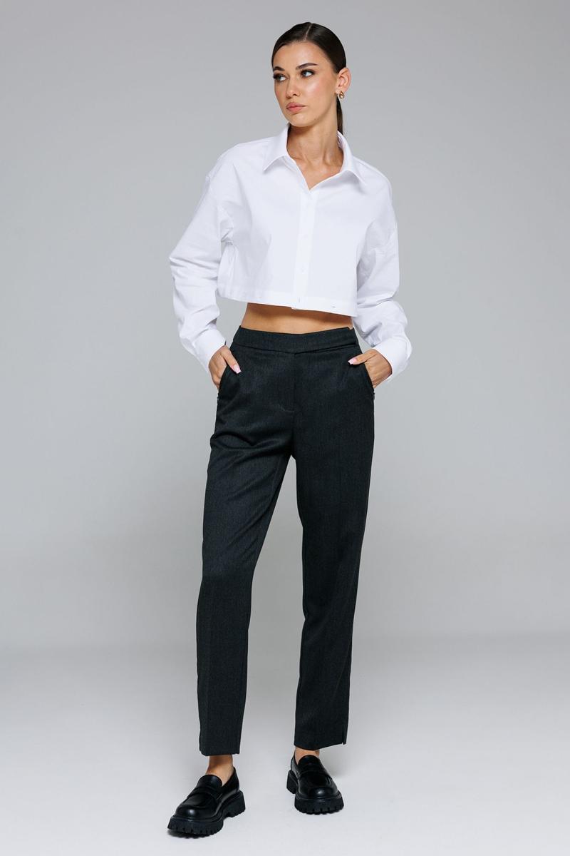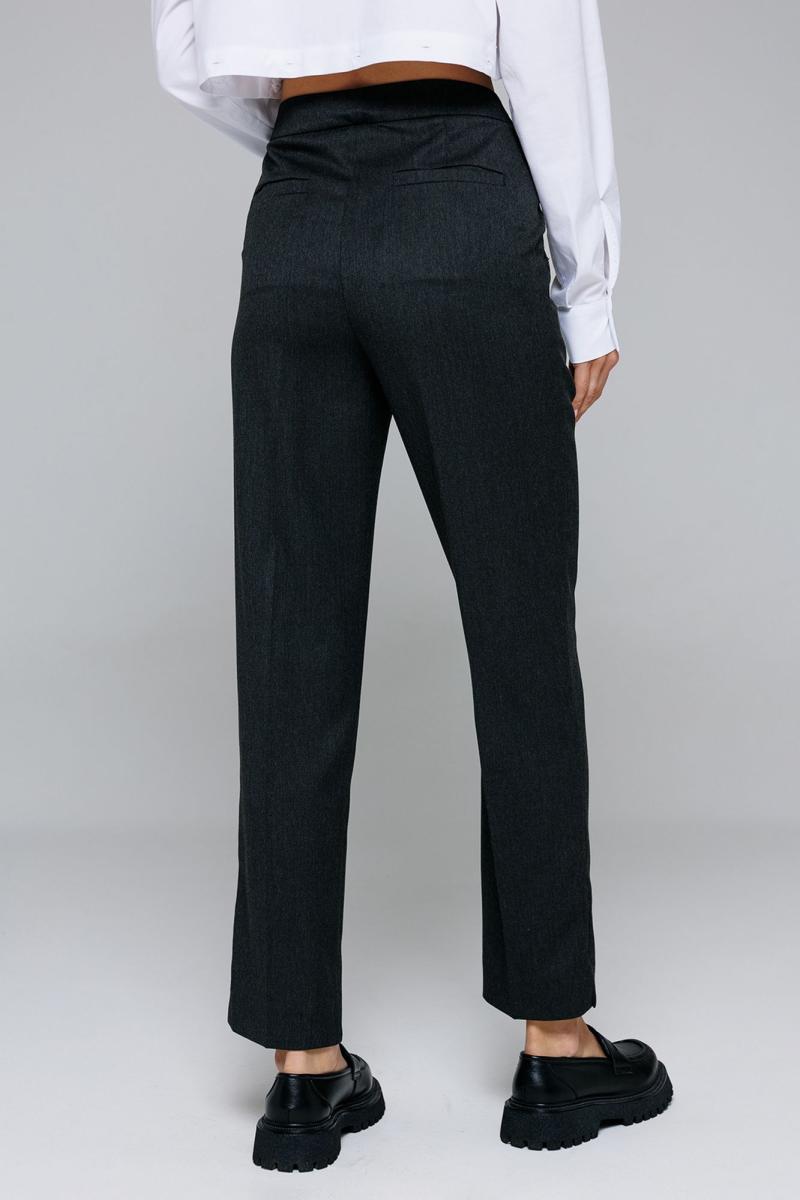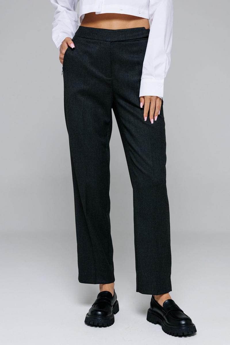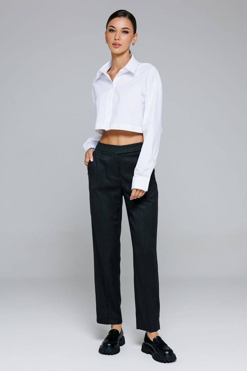 Брюки прямого силуэта на притачном поясе с уступом и застежкой-гульфик, с крючком и потайной петлей-пуговицей на поясе. По переду карманы, застегивающиеся на потайную тесьму-молнию. По спинки вытачки и карманы с листочкой. Внизу по боковым швам обработаны разрезы. застегивающиеся на потайную тесьму-молнию. По спинки вытачки и карманы с листочкой. Внизу по боковым швам обработаны разрезы