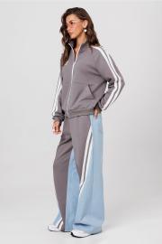 Брюки комбинированные (джинс + трикотаж), прямого силуэта на притачном отстроченном поясе на резинке и втянутым в него декоративным шнурком. По переду карманы в боковых швах с наклонным входом, диагональные рельефы и настрочены широкие лампасы вдоль рельефа. Спинка с накладными карманами.