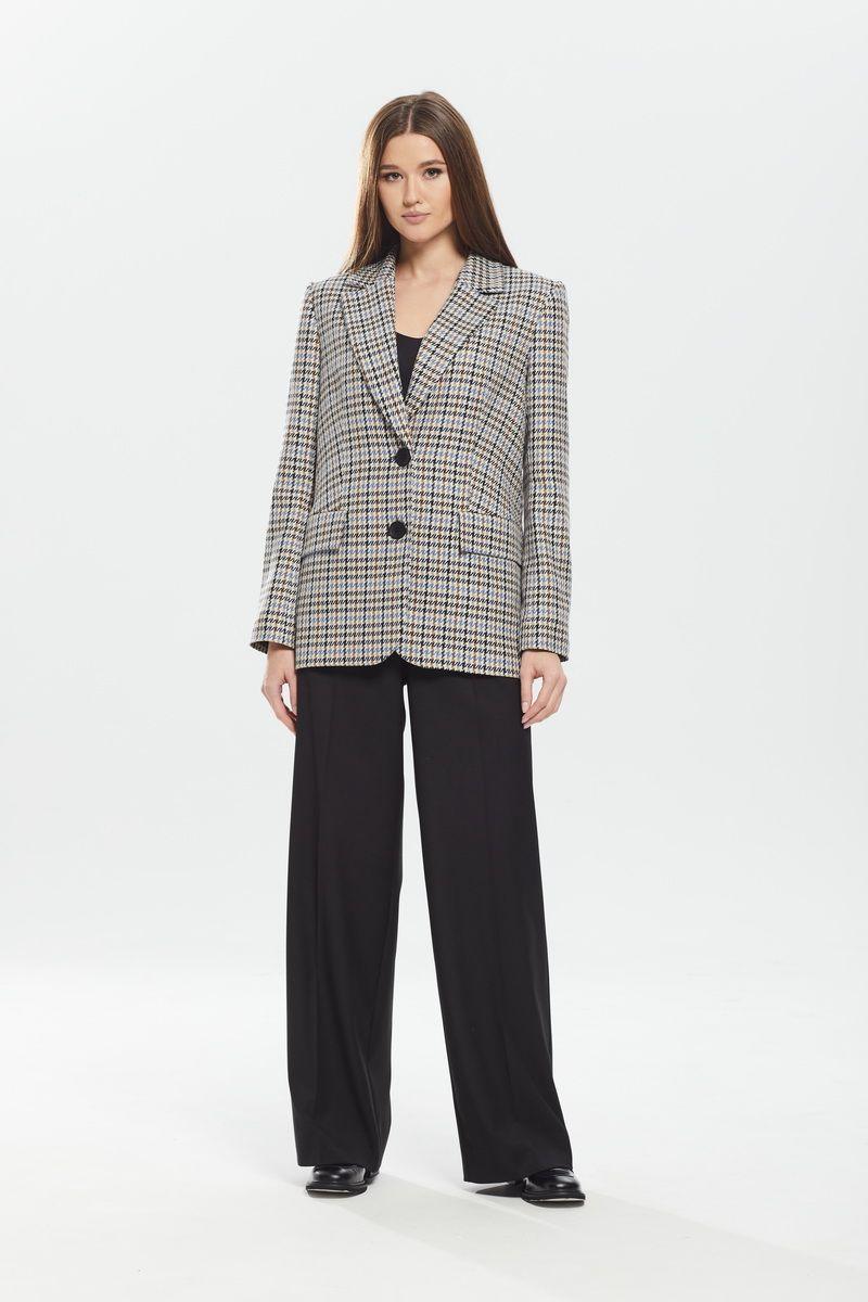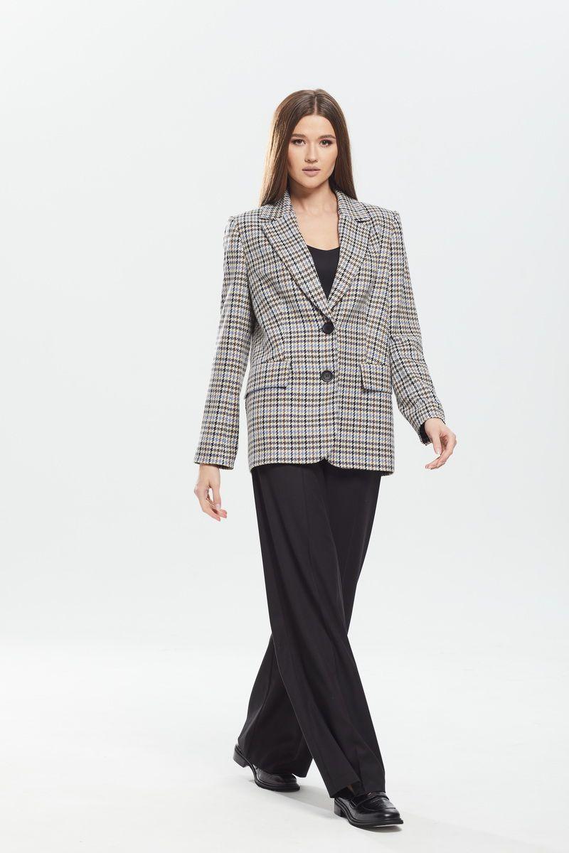 Брюки прямого силуэта, верх брюк обработан притачным поясом . В верхней части брюк расположены карманы .