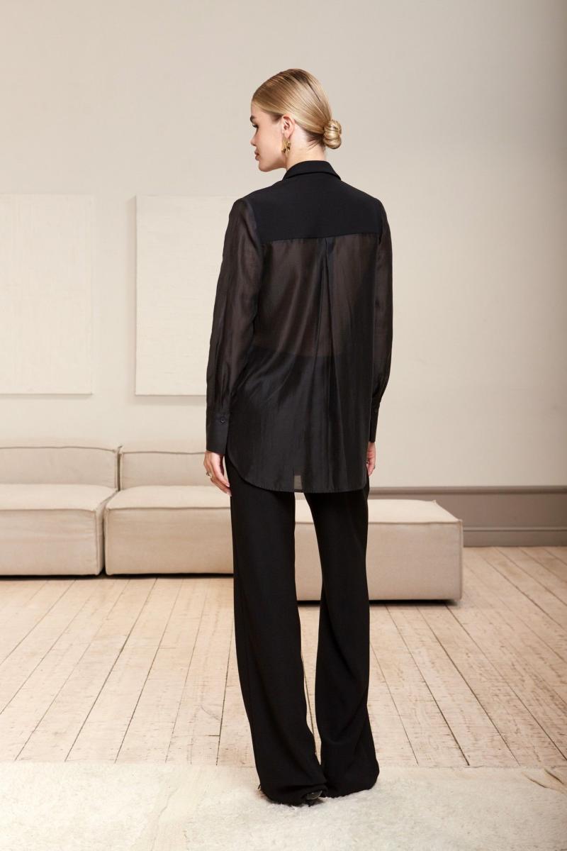Брюки из костюмно-плательного крепа, с посадкой на талии, прямые от бедра, длиной ниже щиколотки. Передние половинки с карманами, наклонными к боковым швам, с застёжкой на молнию в среднем шве. Задние половинки с талиевыми вытачками и сборкой по шву притачивания пояса. Пояс с застёжкой на петлю и пуговицу по переду и эластичной тесьмой на участке спинки.