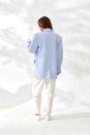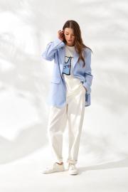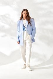 Брюки женские из хлопковой с эластаном ткани, слегка укороченные и зауженные книзу. По переду боковые карманы с отрезным бочком и застежка на молнию с гульфиком и откоском. По задним половинкам талиевые вытачки и накладные карманы. Пояс притачной со шлевками, застегивается на пуговицу.