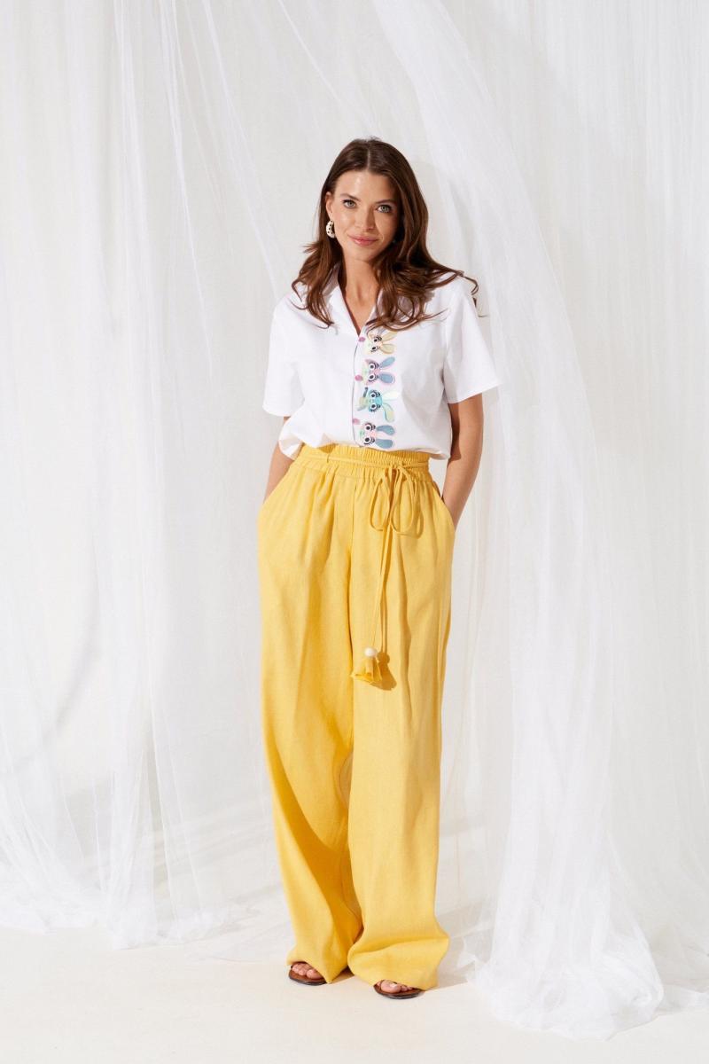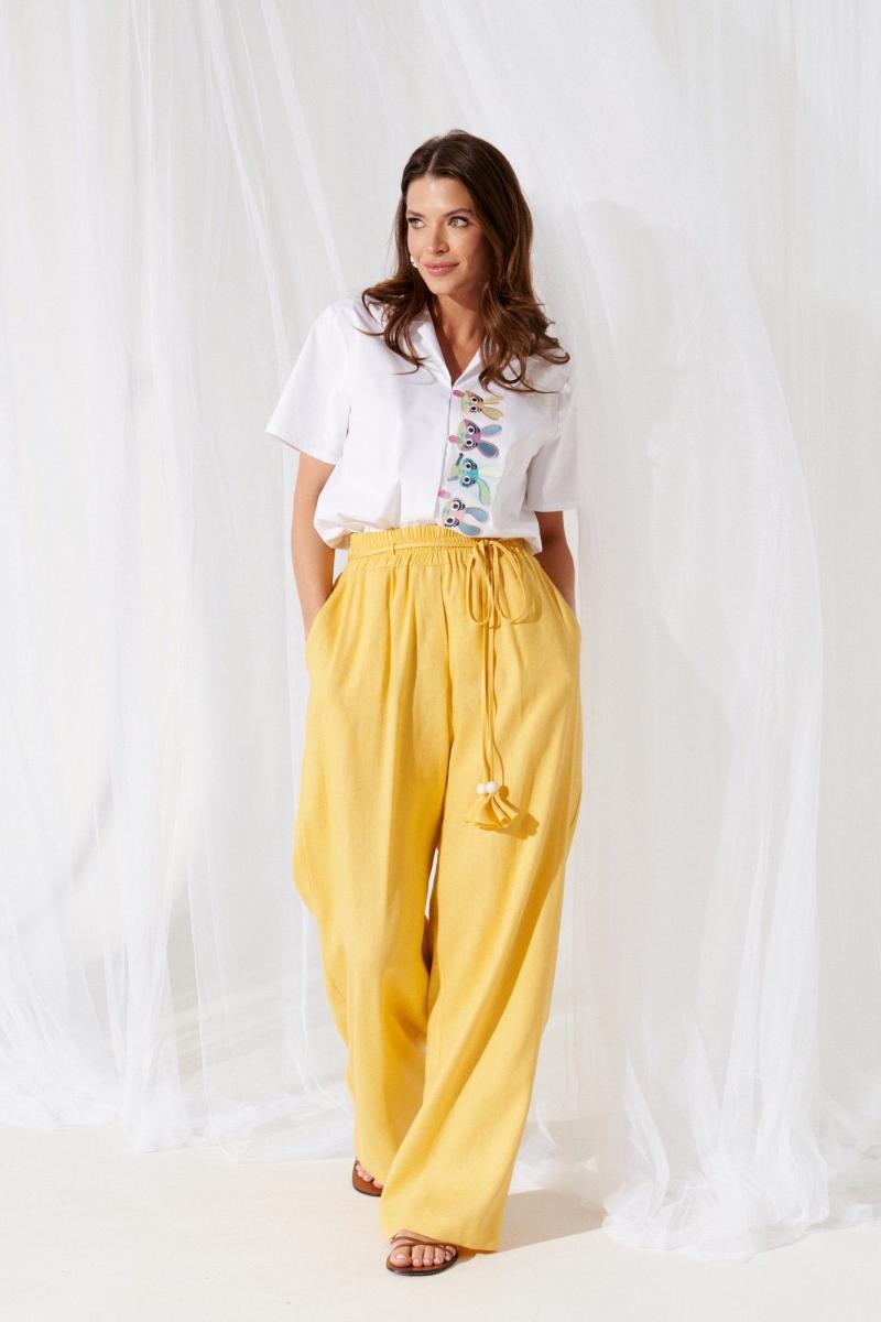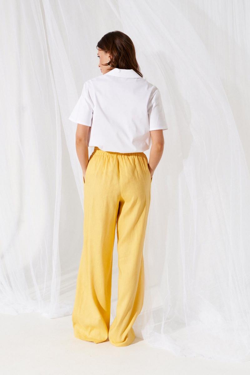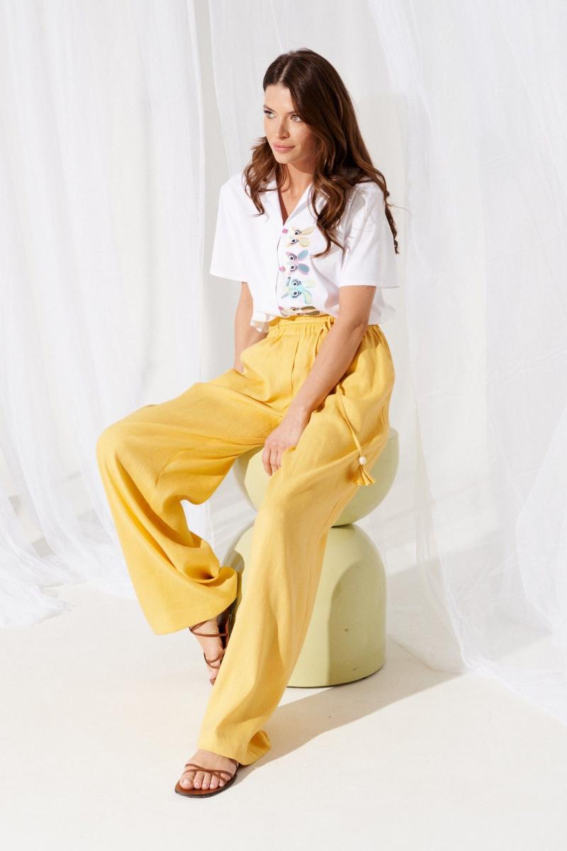 Брюки женские из льняной ткани прямые широкие длинные на притачном широком поясе с резинкой. По передним половинкам боковые карманы с отрезным бочком и имитация застежки с гульфиком (пришит ряд маленьких пуговиц по гульфику). Низ брюк обработан с закрытым срезом. По поясу спереди и сзади притачаны по 2 коротких шлевки, в которые втянут поясок-шнурок из основной ткани с кисточками и деревянными бусинами.
