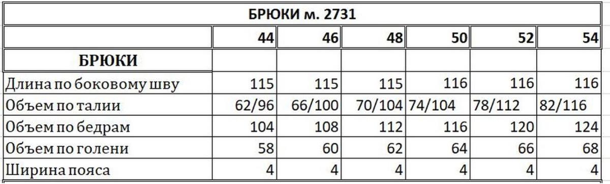 Таблица размеров