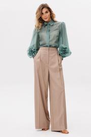 Брюки-палаццо выполнены из костюмной ткани. Брюки на притачном поясе, длиной в пол, по бокам лампасы, складки и боковые карманы. Застежка спереди на молнию. Передняя и задняя часть брюк заутюжены на кант. Длина брюк с поясом - 114 см.