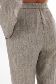 Брюки выполнены из костюмной ткани меланж с рисунком "елочка". Брюки зауженные к низу, длиной 7/8, на притачном поясе. Спереди боковые карманы с наклонным входом и застежка на пуговицу и молнию с гульфиком. По задней части пояса эластичная тесьма. Передние и задние части брюк заутюжены на кант.